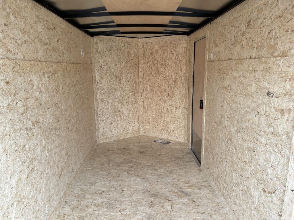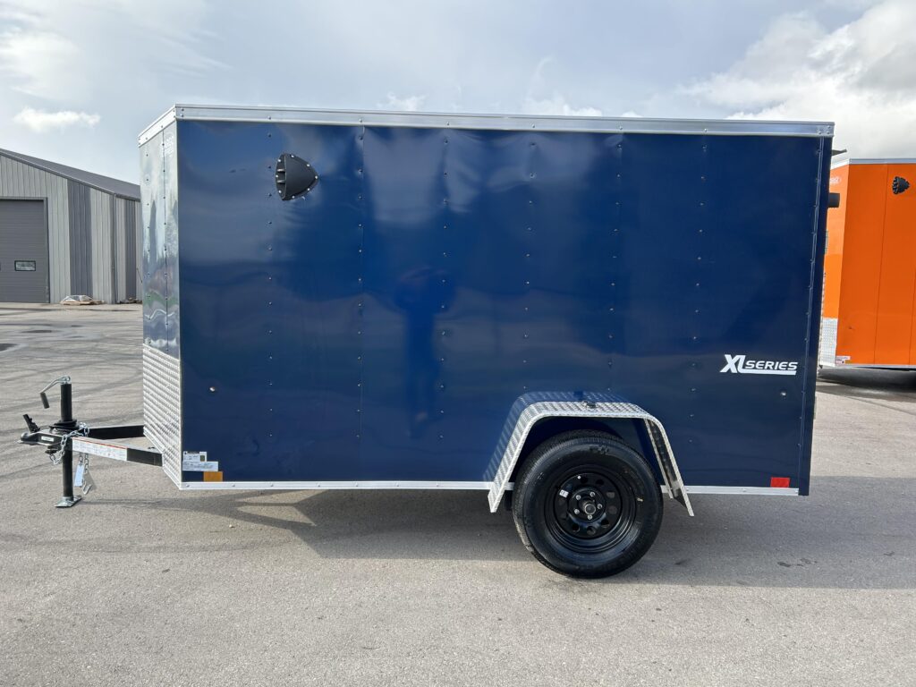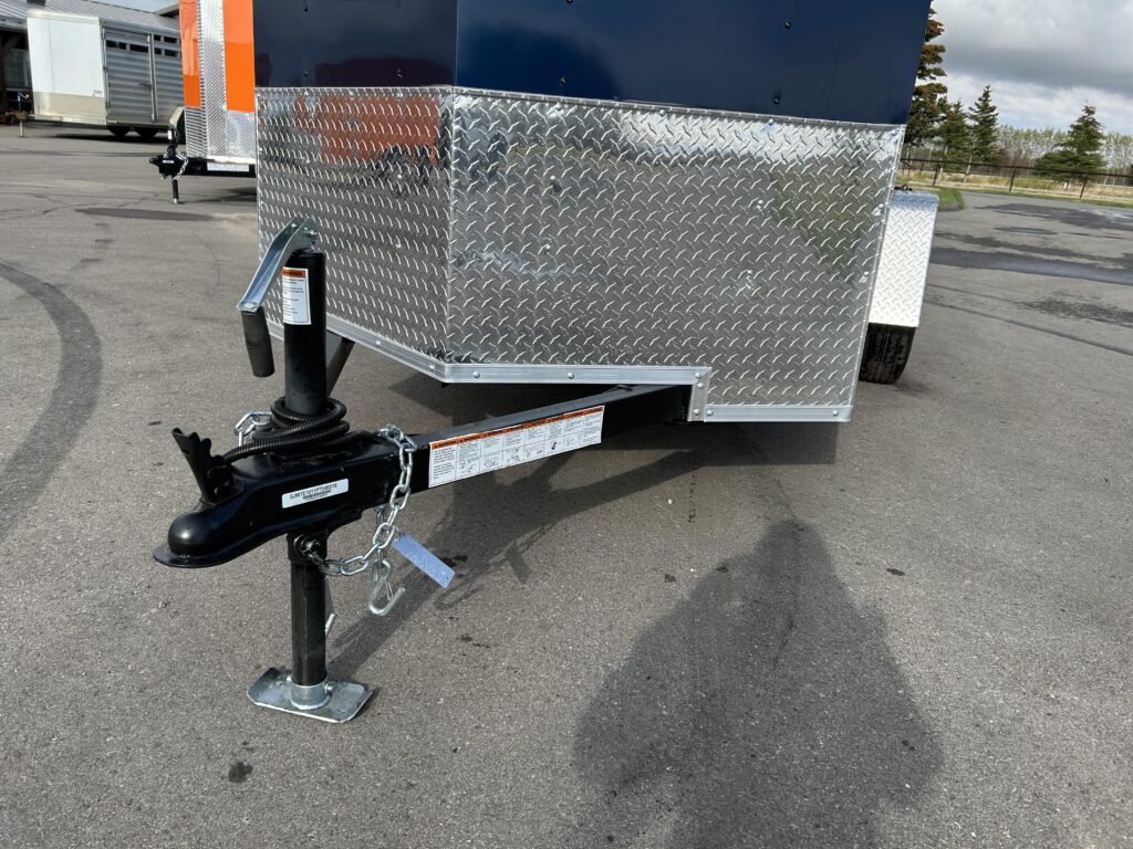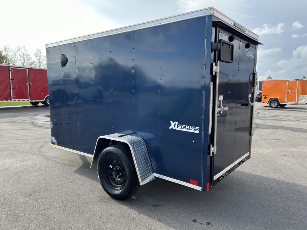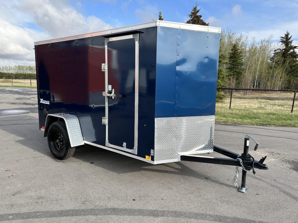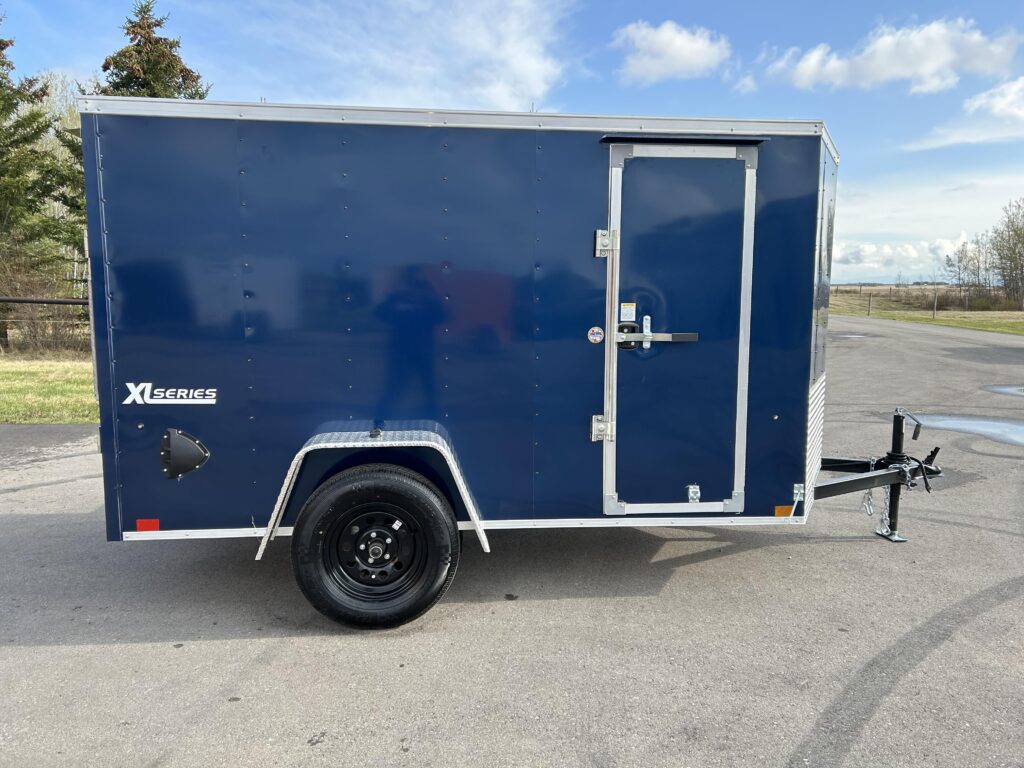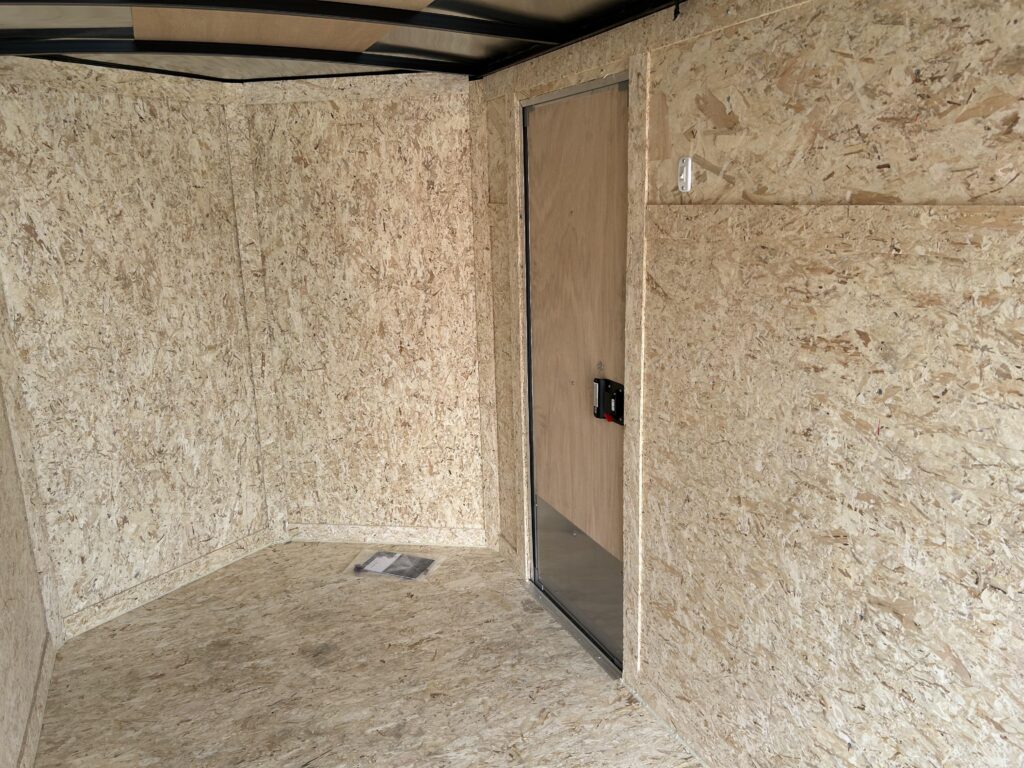 2023 5×10 Enclosed cargo trailer. 18″ V-nose front with 24″x62″ RV Man door with a bar lock!