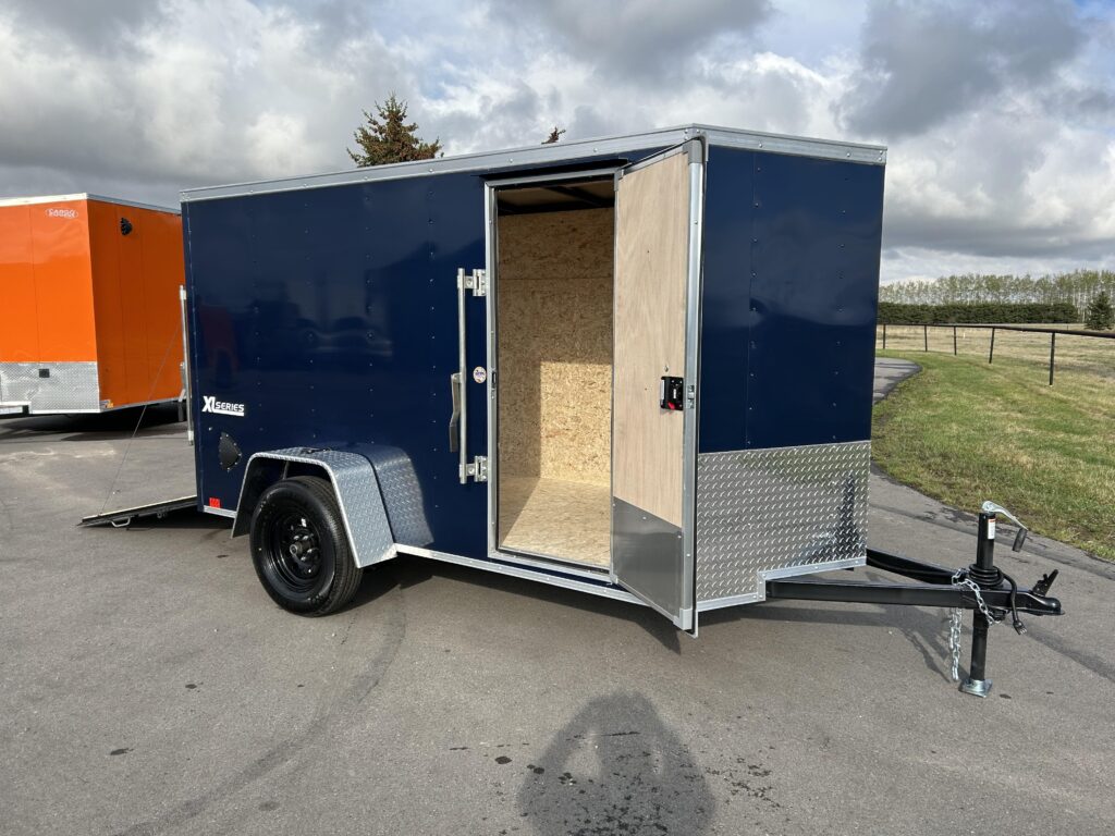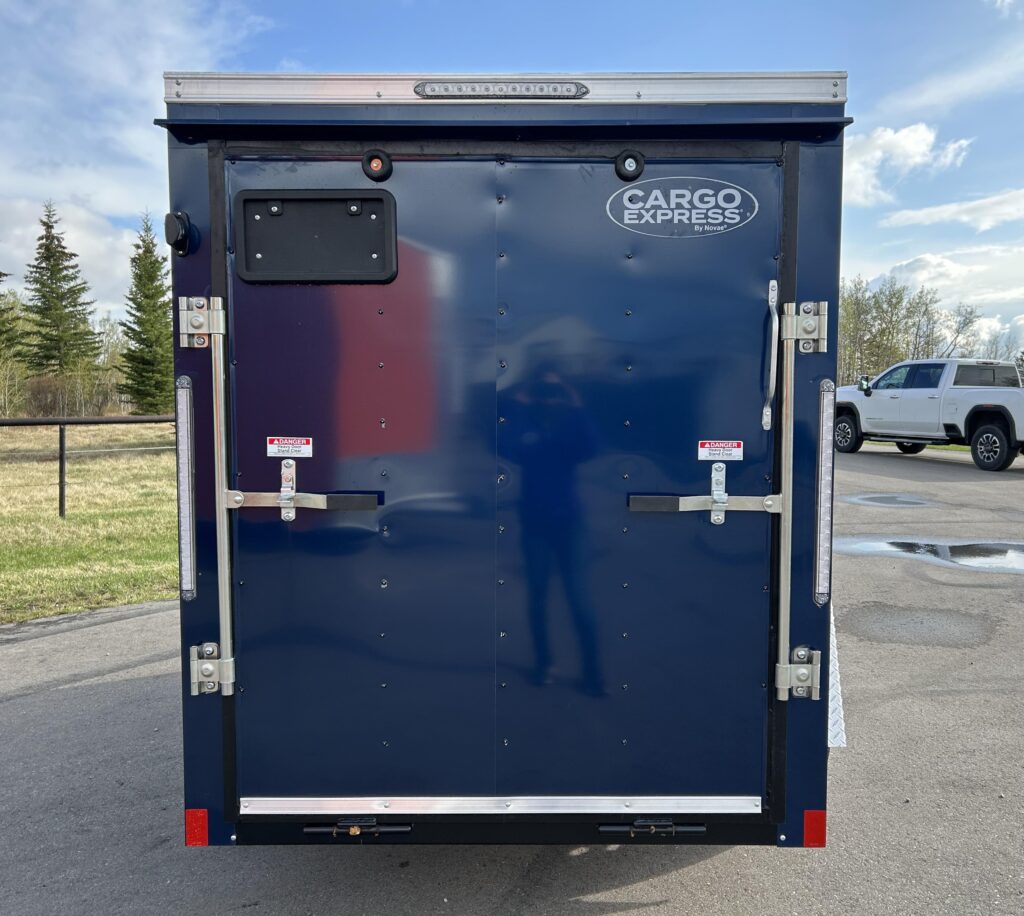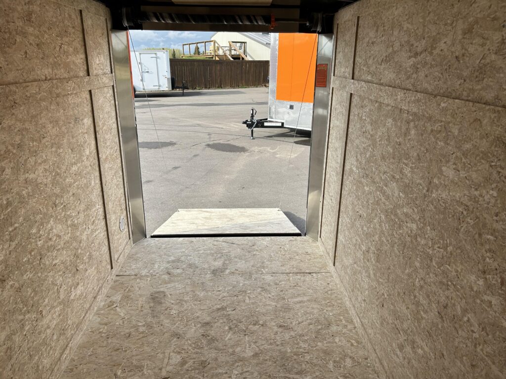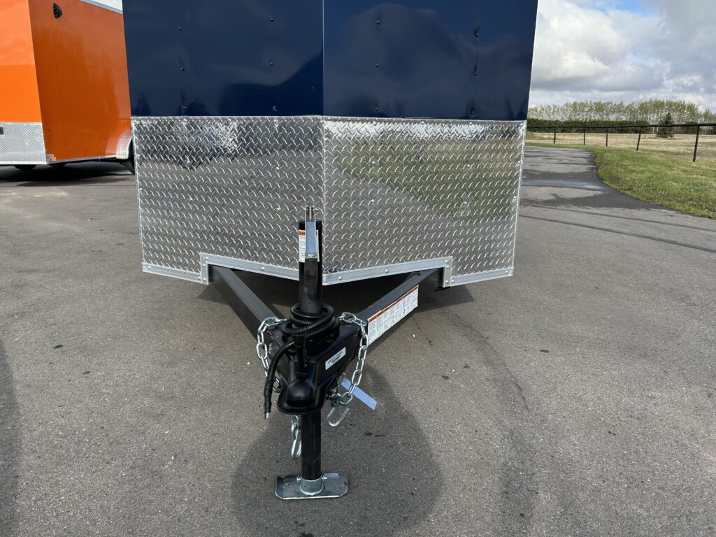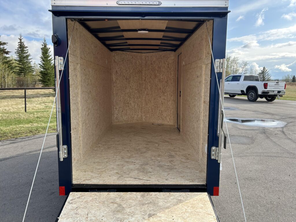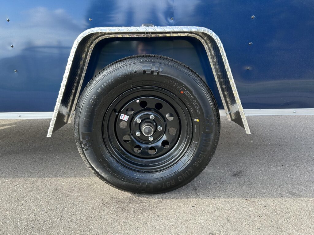 2023 5×10 Enclosed cargo trailer. 18″ V-nose front with 24″x62″ RV Man door with a bar lock!