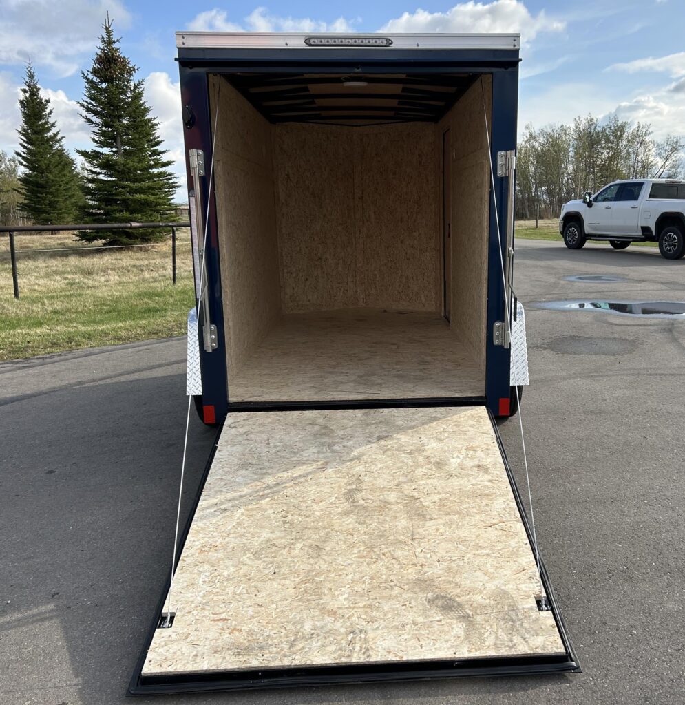 66″ Interior height, spring assisted ramp rear door. 2,000lb top wind jack and black wheels.