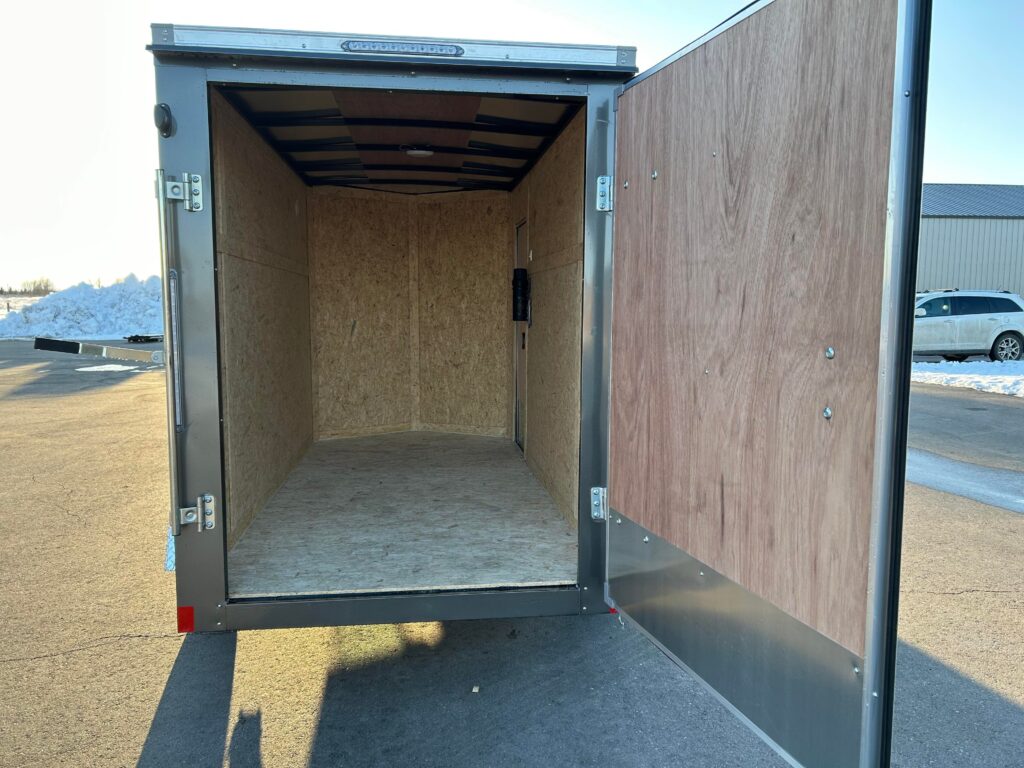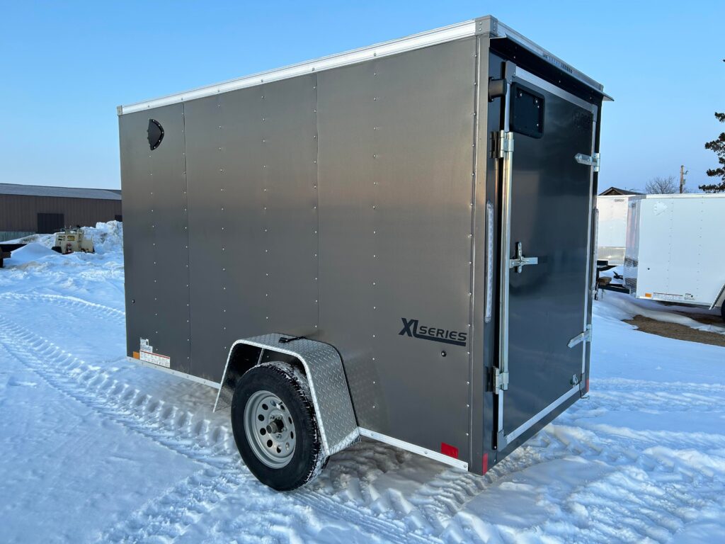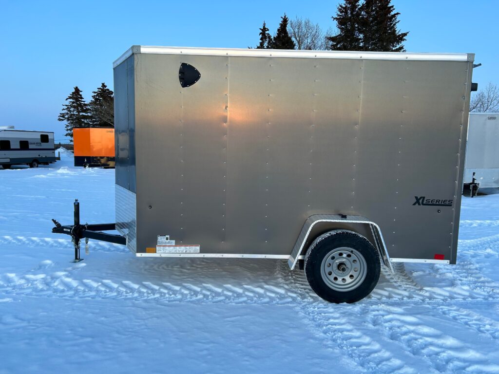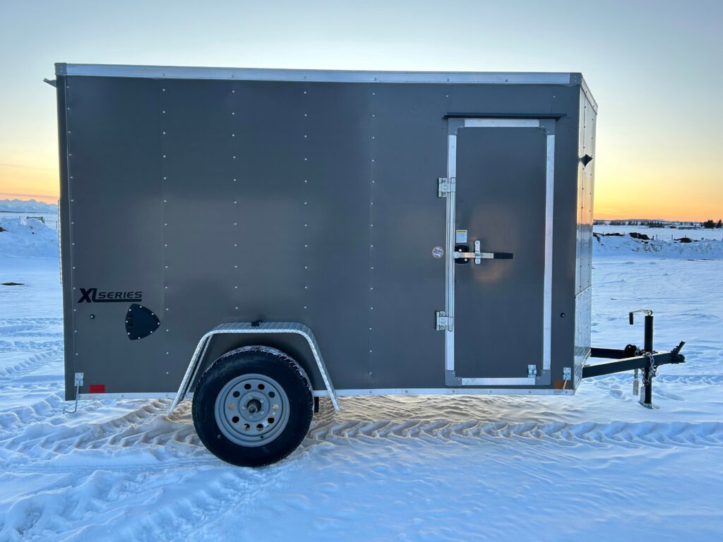 Brand new 2023 5’x10′ Enclosed cargo trailer. Beautiful charcoal, single rear barn door, 3,500lb axle, RV man door with a bar lock, automotive undercoating.