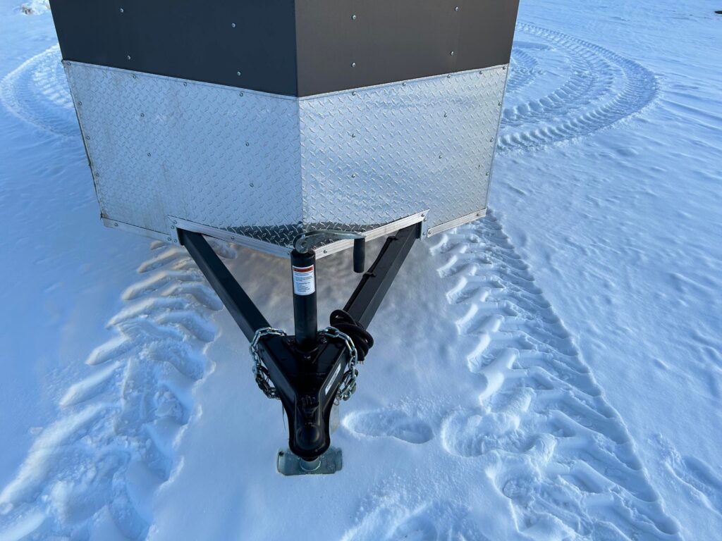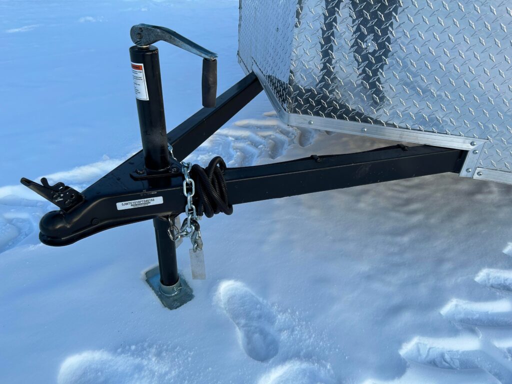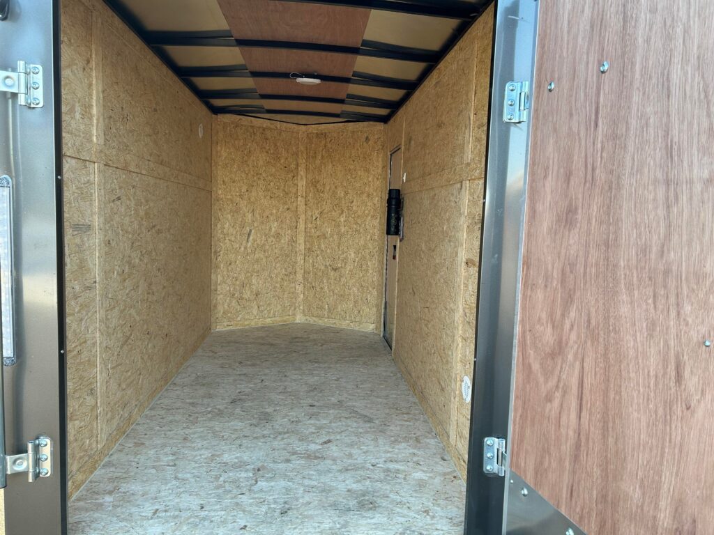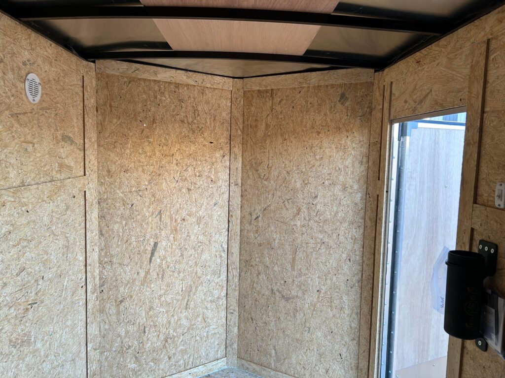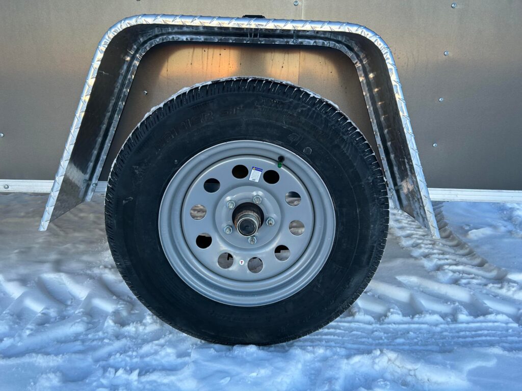 Brand new 2023 5’x10′ Enclosed cargo trailer. Beautiful charcoal, single rear barn door, 3,500lb axle, RV man door with a bar lock, automotive undercoating.