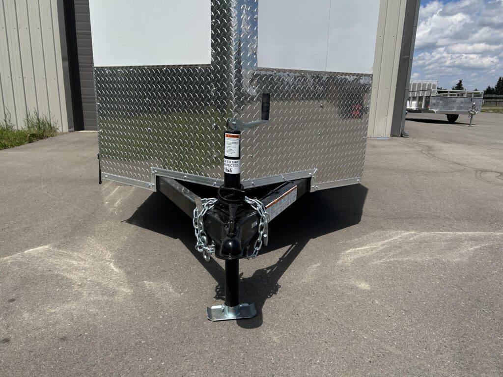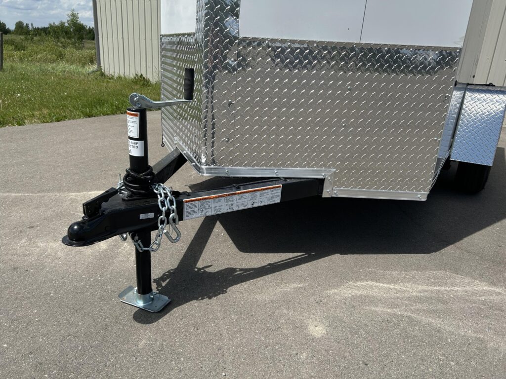 Finished in white screw less aluminum, 3″ main tube frame. 16″ O.C Floor and walls. 24″ sloped front v-nose. 2,000lb jack.