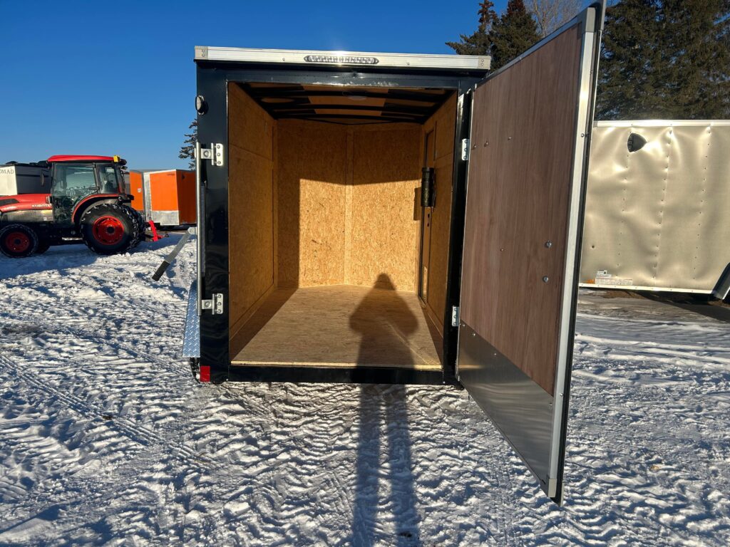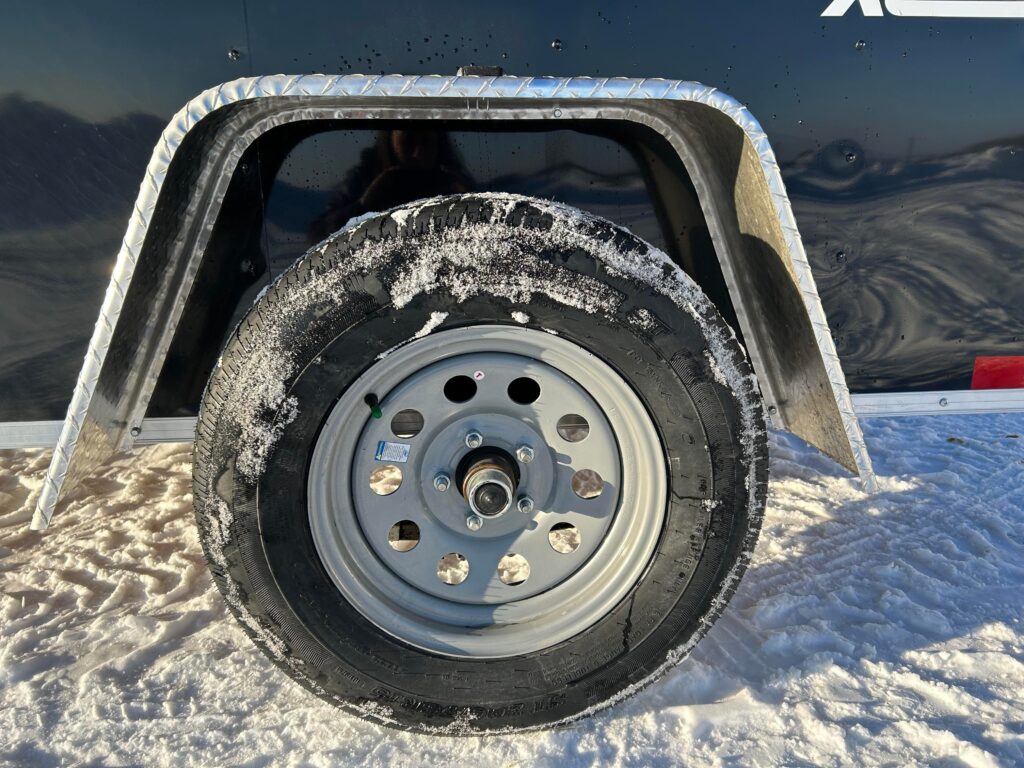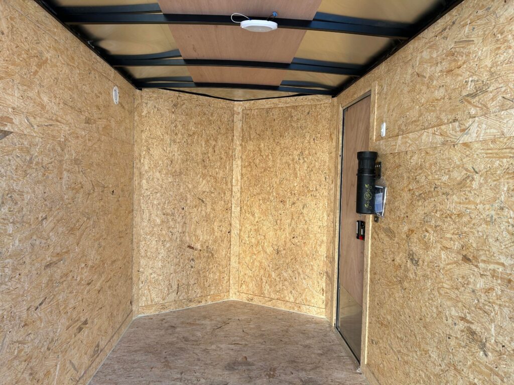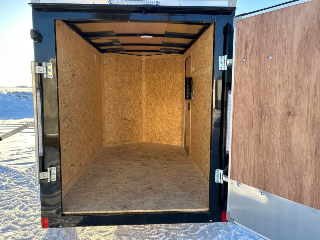 5×8 with 18″ V-nose, 3,500lb axle, single rear barn door. RV door with an extra cam bar lock! LED Dome light and automotive undercoating.