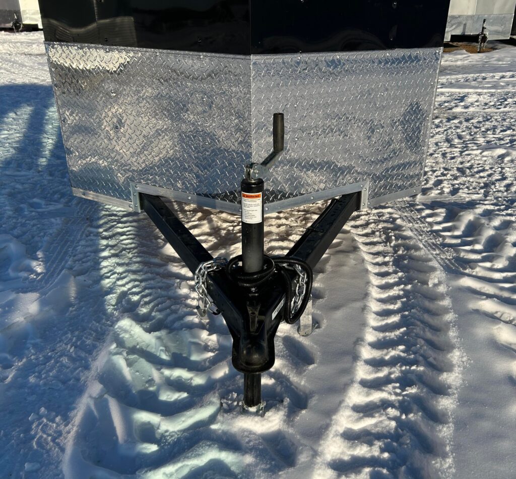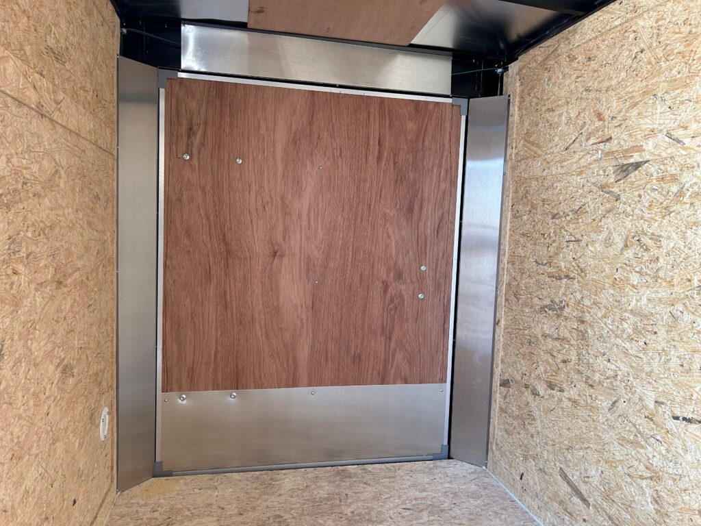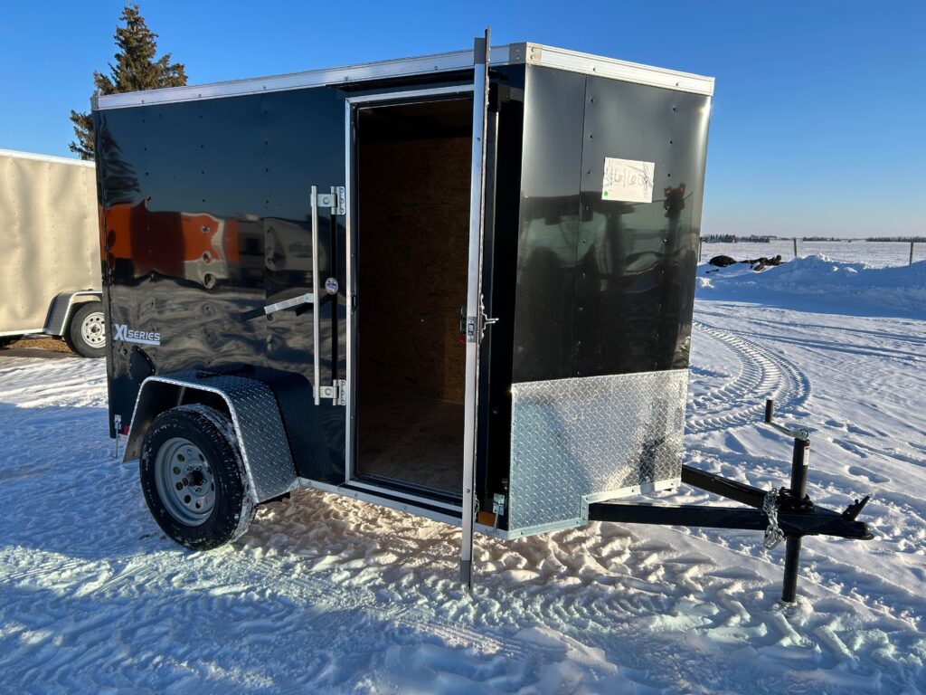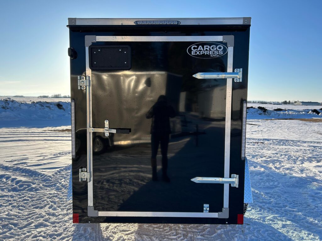5×8 with 18″ V-nose, 3,500lb axle, single rear barn door. RV door with an extra cam bar lock! LED Dome light and automotive undercoating.