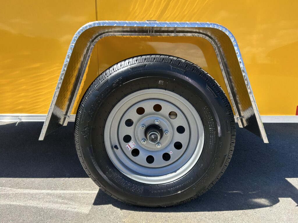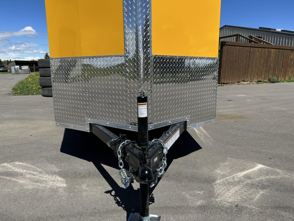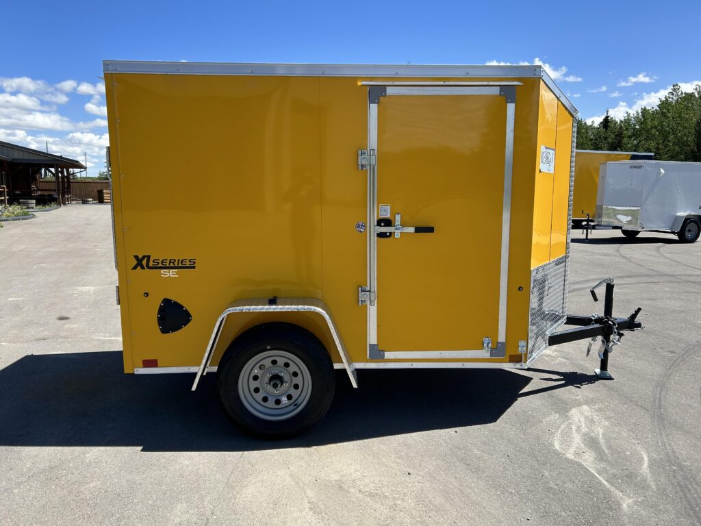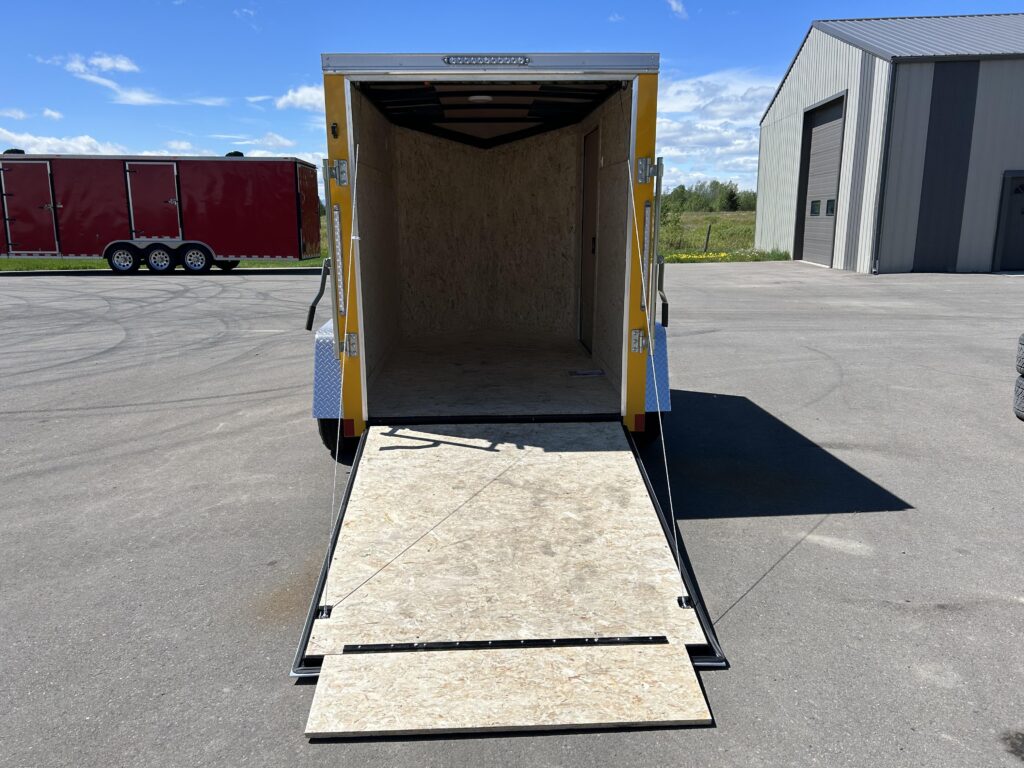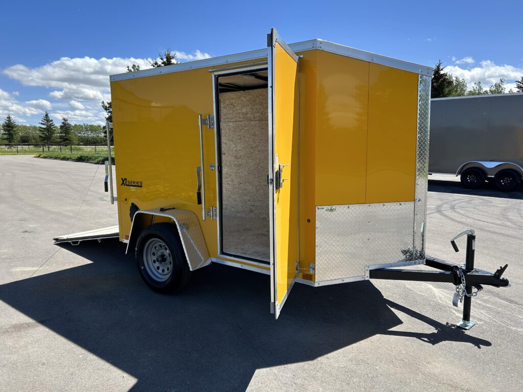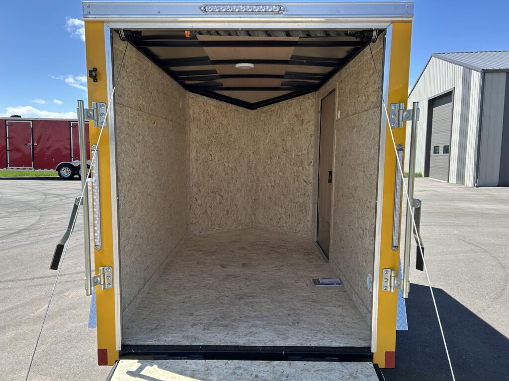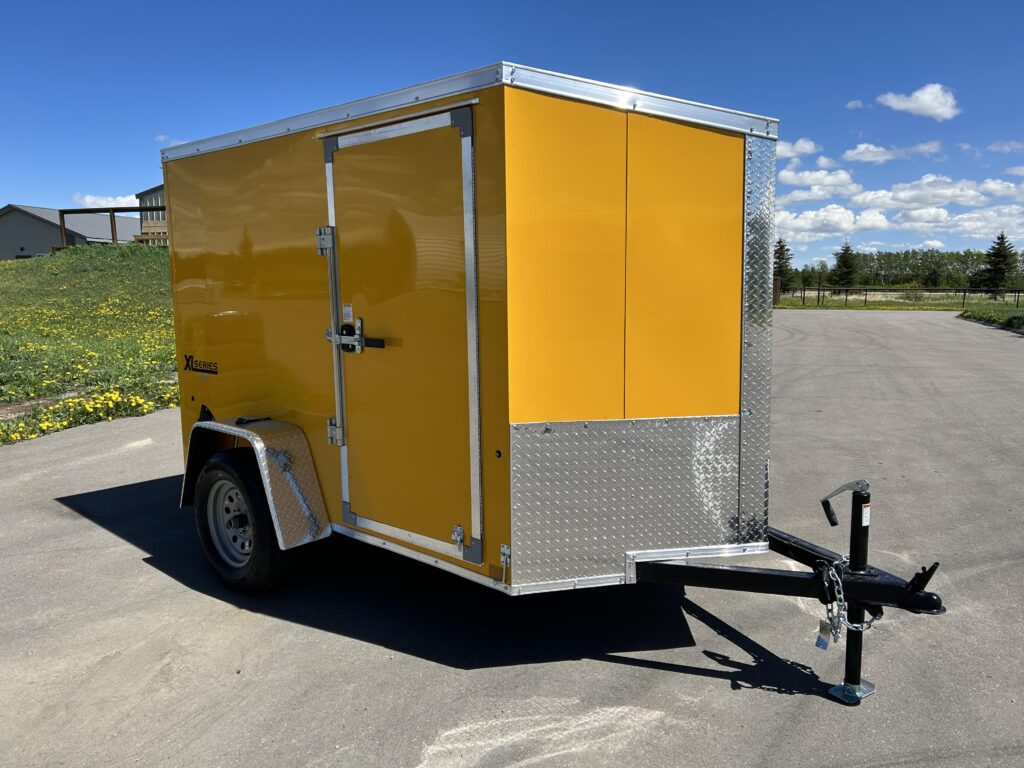 2023 5×8 Enclosed cargo trailer, stunning yellow, 24″ sloped v-nose, automotive undercoating, spring assisted ramp door, RV man door with a bar lock and a dome light!