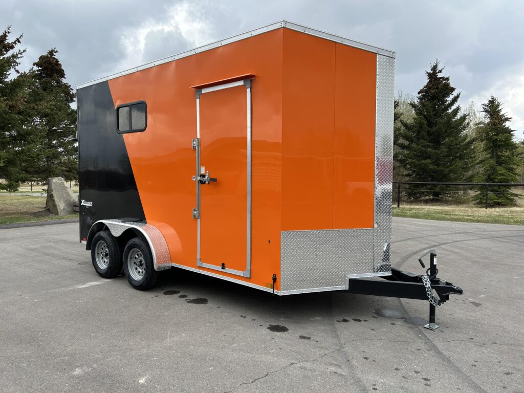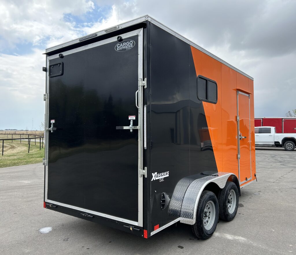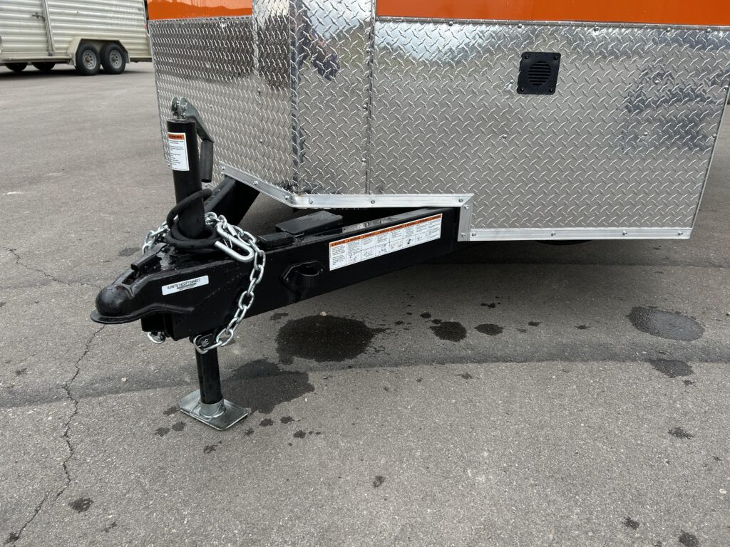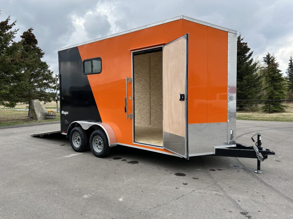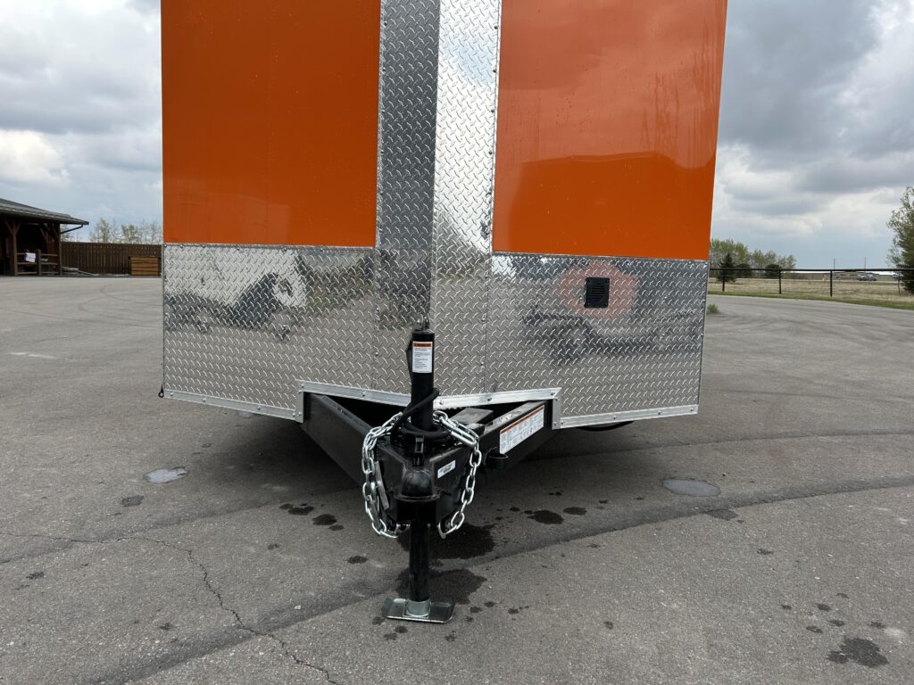 Finished in a two-tone orange and black! Automotive undercoating. Spring assisted ramp door with a 12″ ramp extension. 32″x78″ RV man door with a bar lock.
