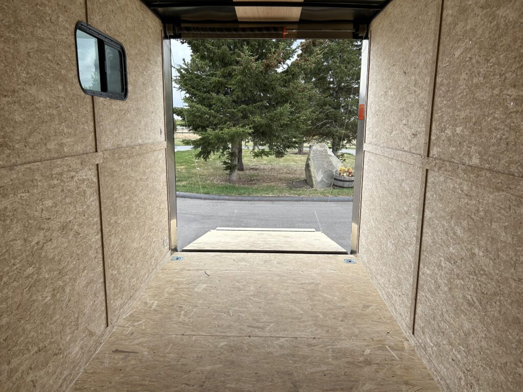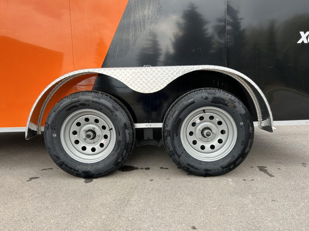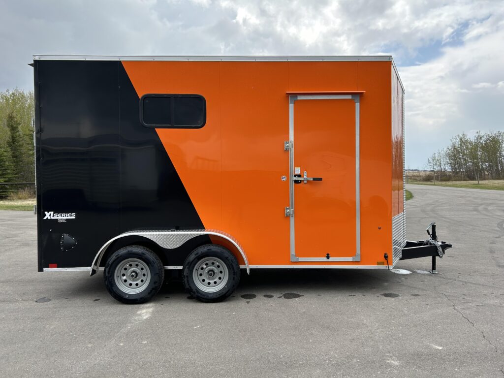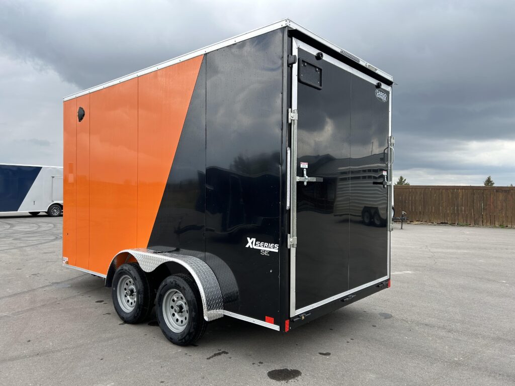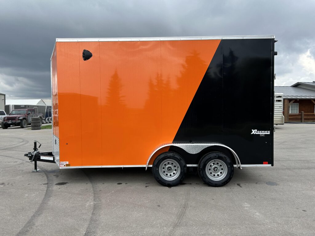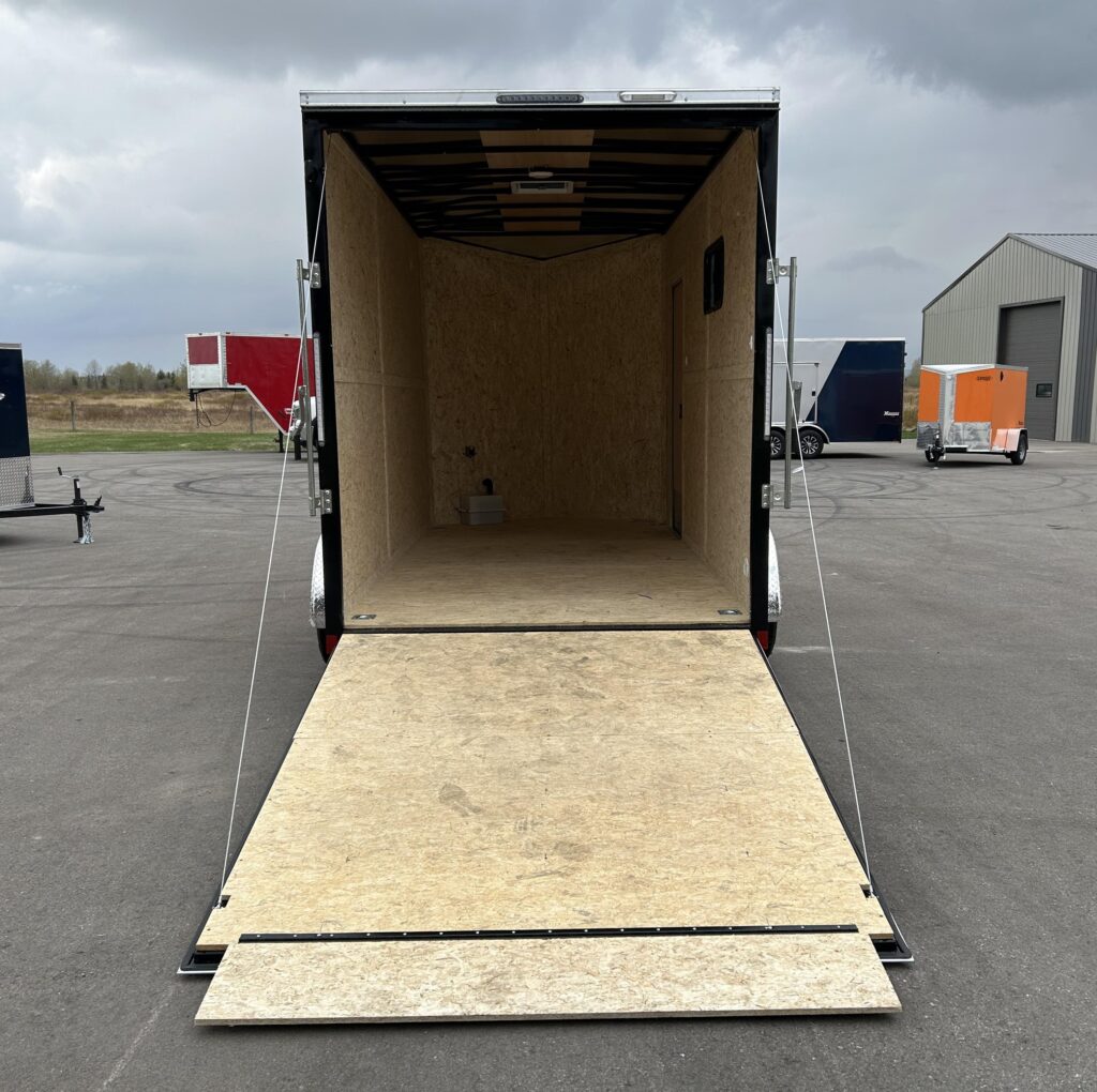 Finished in a two-tone orange and black! Automotive undercoating. Spring assisted ramp door with a 12″ ramp extension. 32″x78″ RV man door with a bar lock.