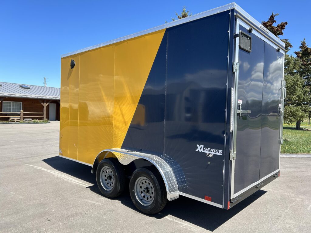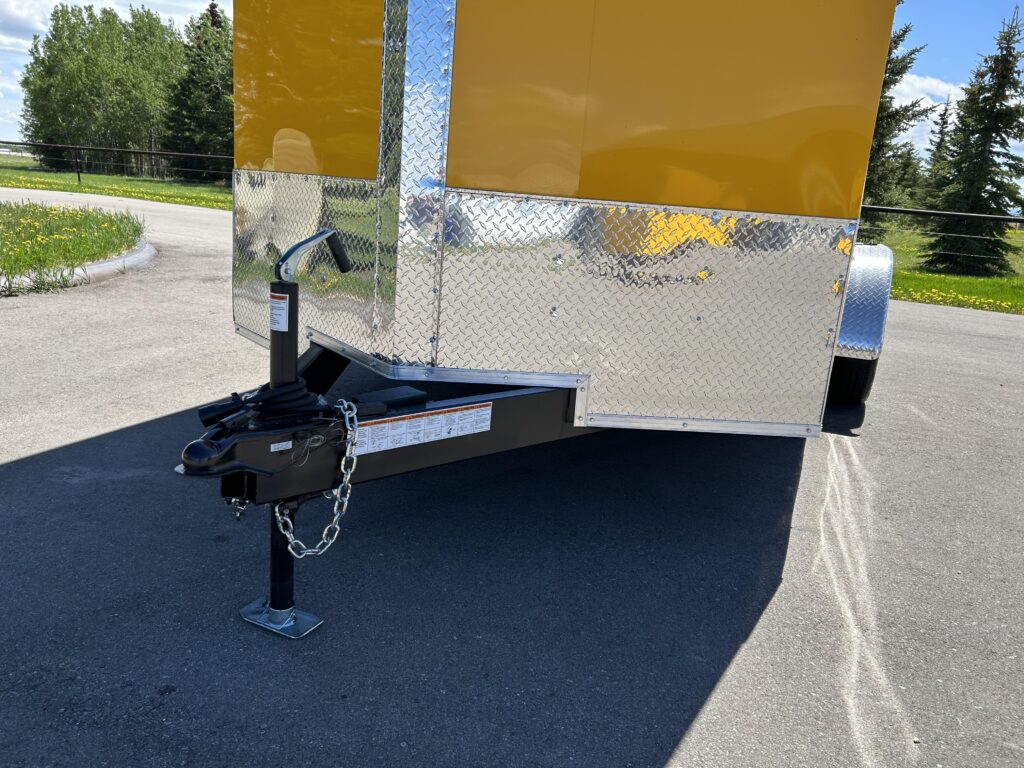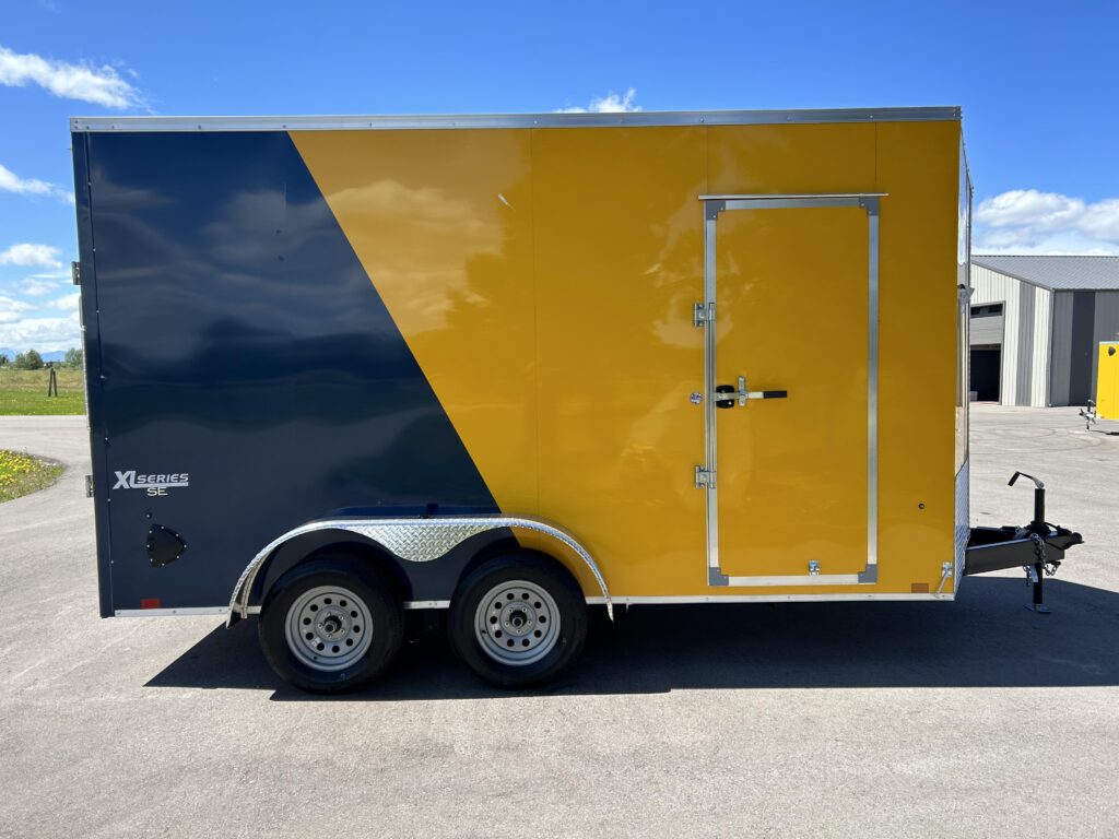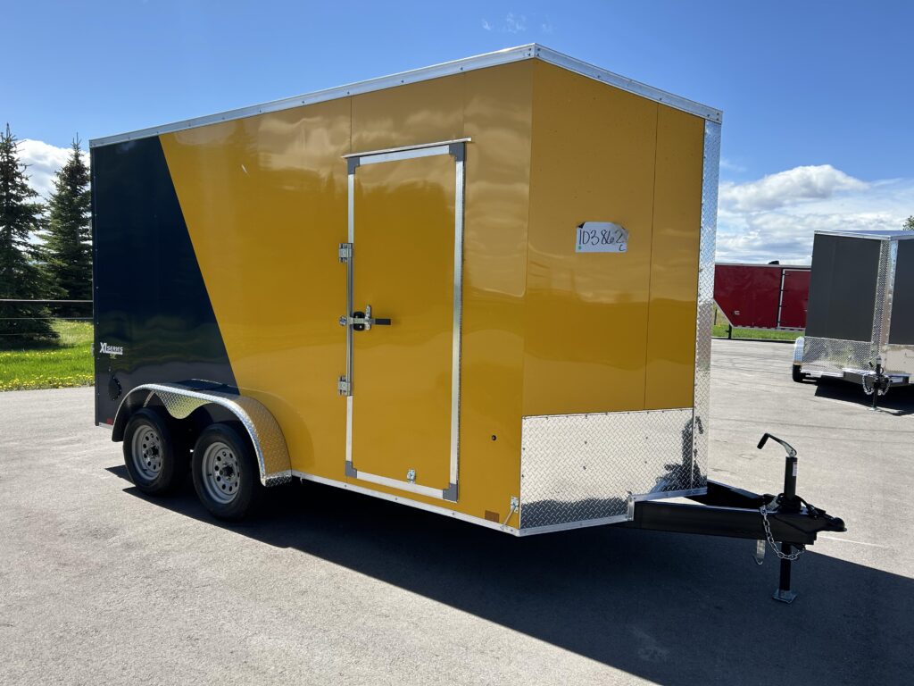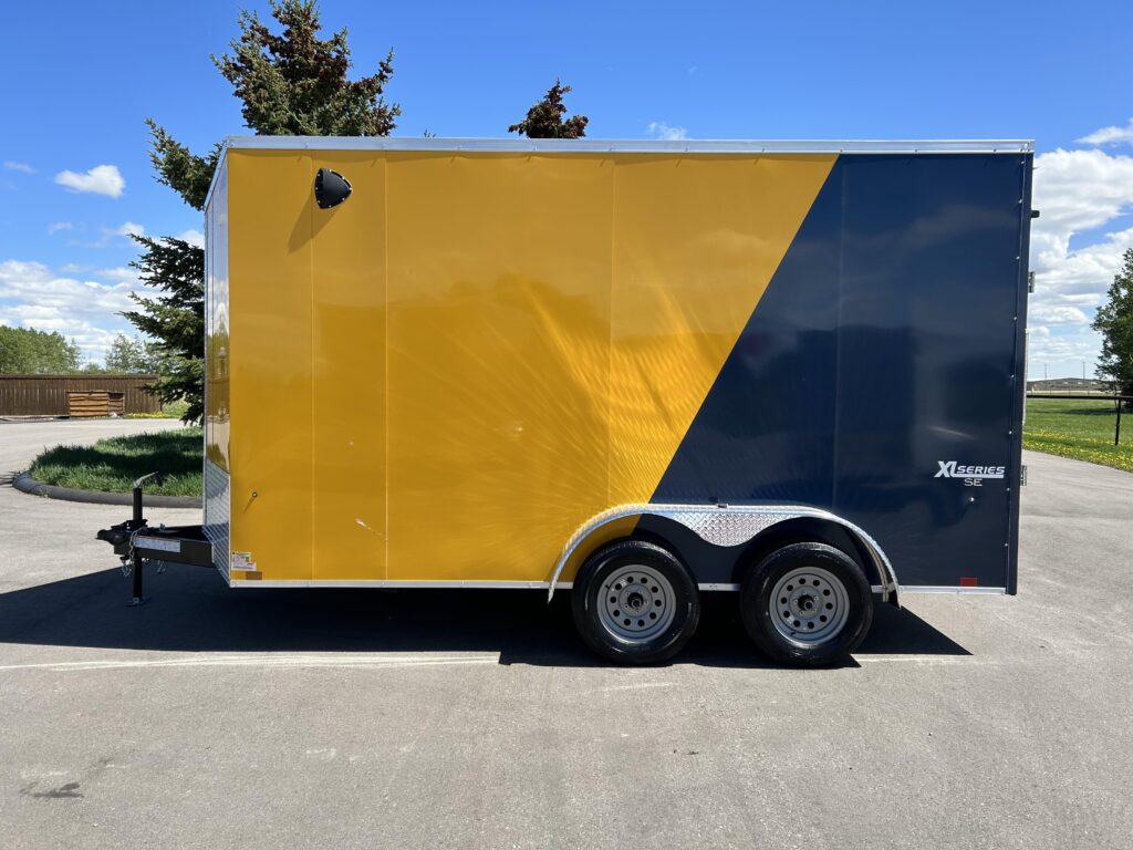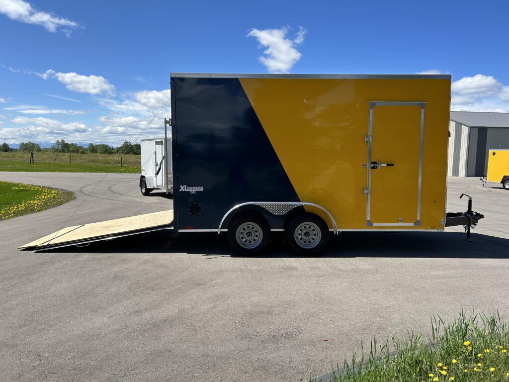 Brand new 7’x14′ Enclosed Cargo Trailer with a 24″ sloped v-nose. 2-3,500lbs axles, automotive undercoating, spring assisted door with a 12″ ramp extension.