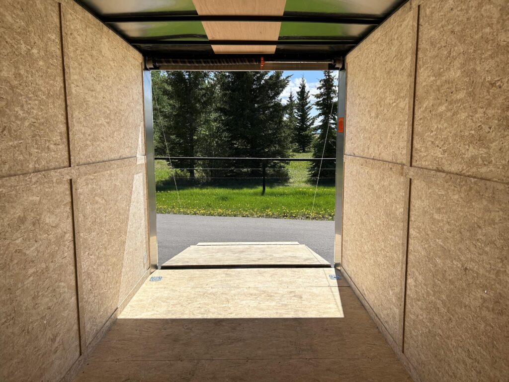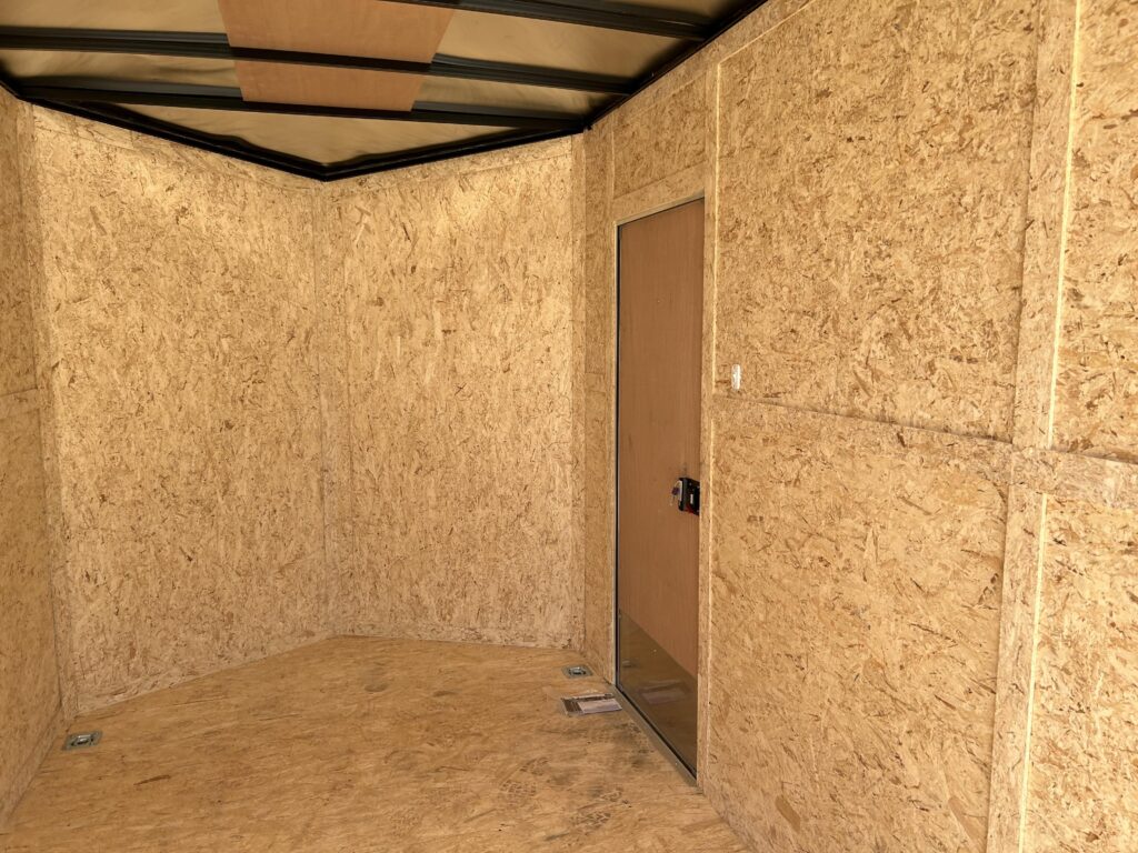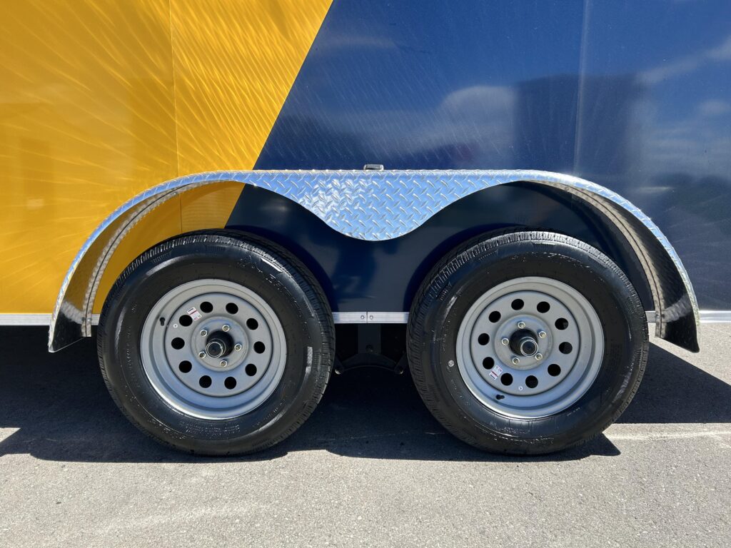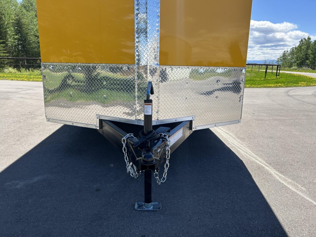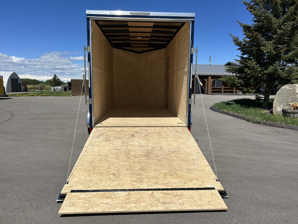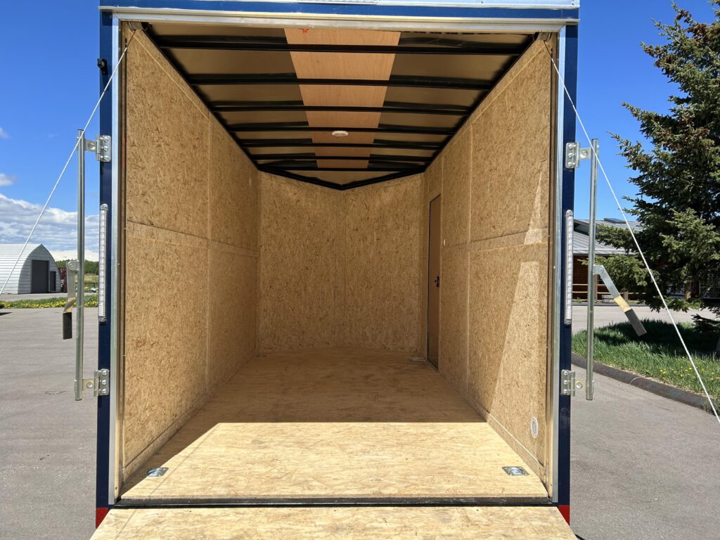 Brand new 7’x14′ Enclosed Cargo Trailer with a 24″ sloped v-nose. 2-3,500lbs axles, automotive undercoating, spring assisted door with a 12″ ramp extension.