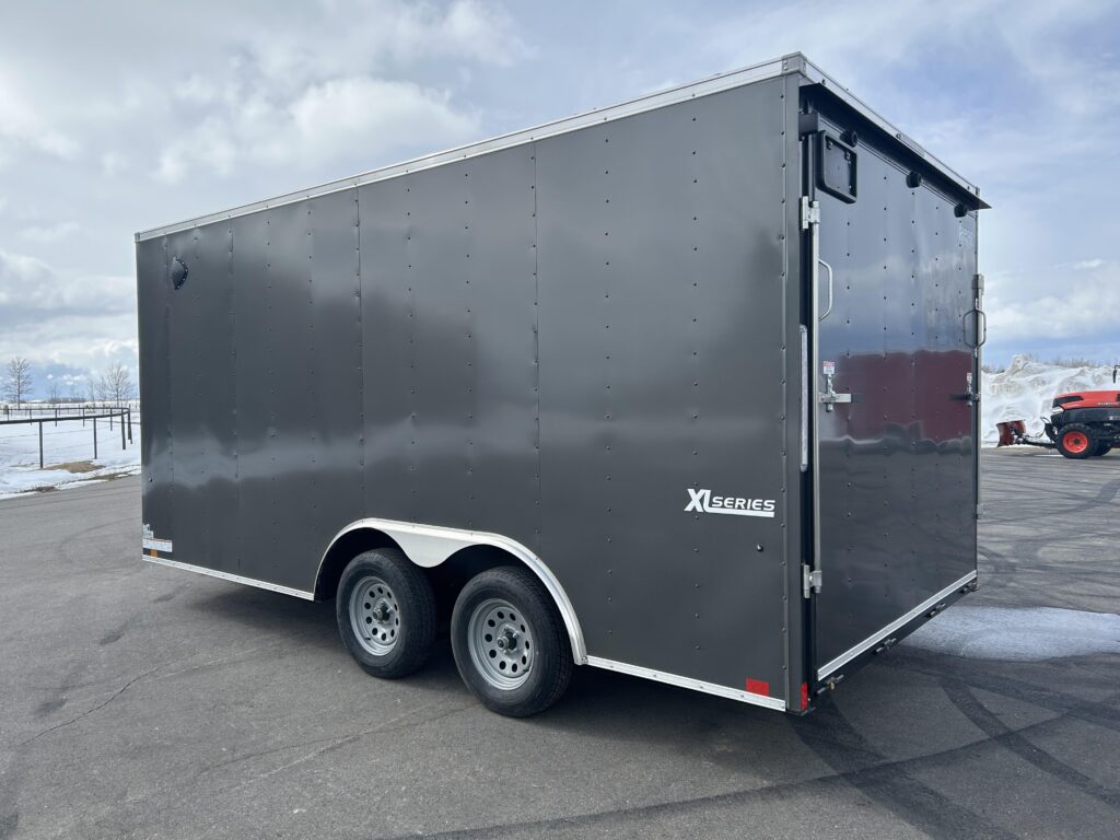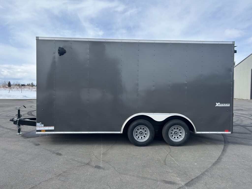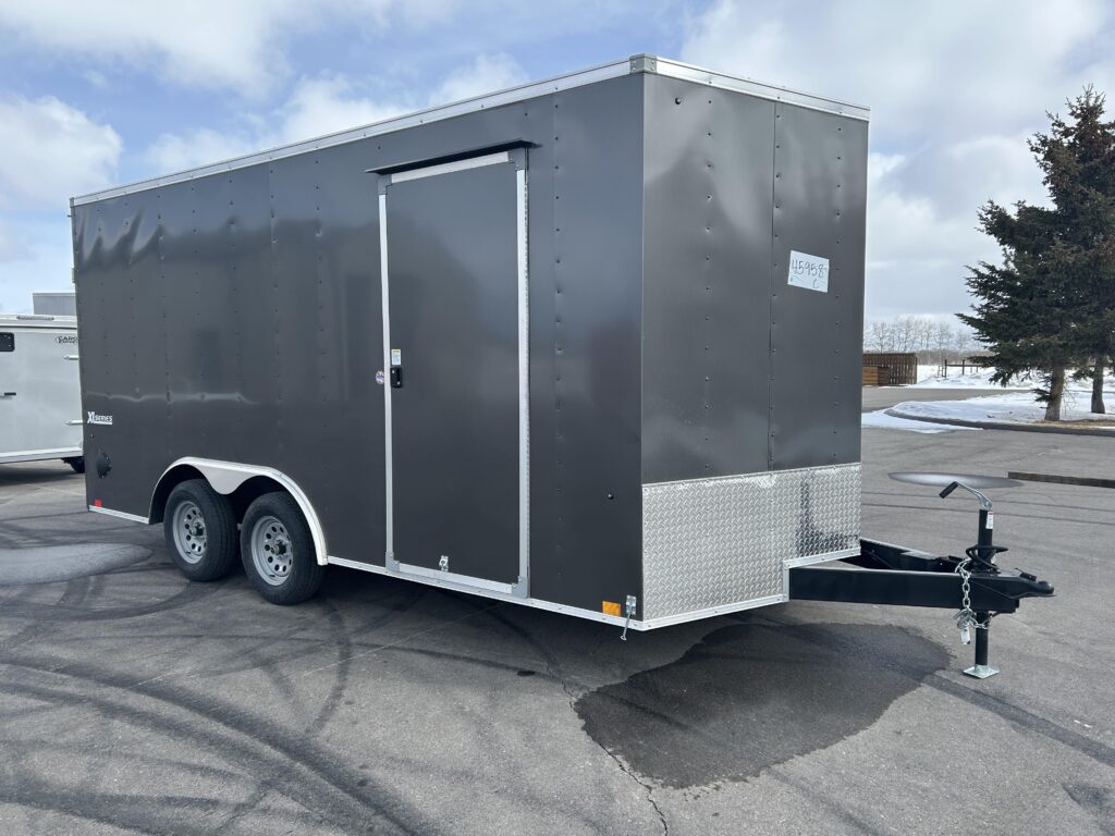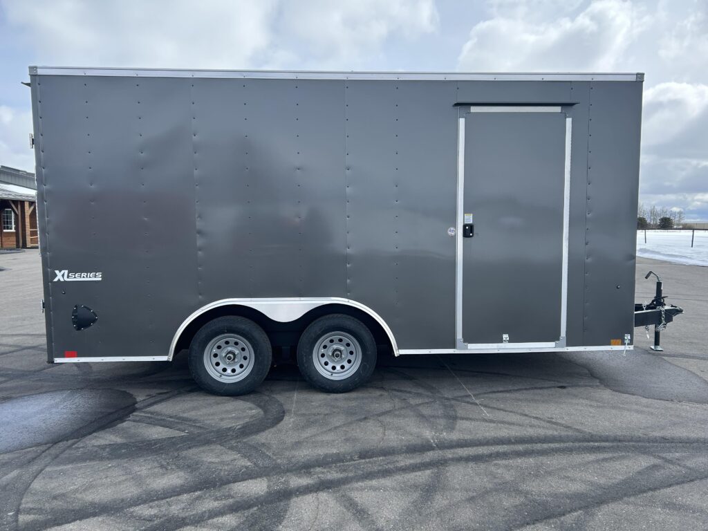 8.5×16′ enclosed cargo trailer. Beautiful charcoal exterior, 18″ v-nose