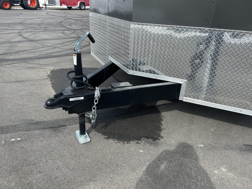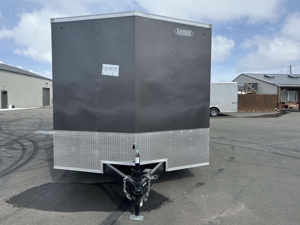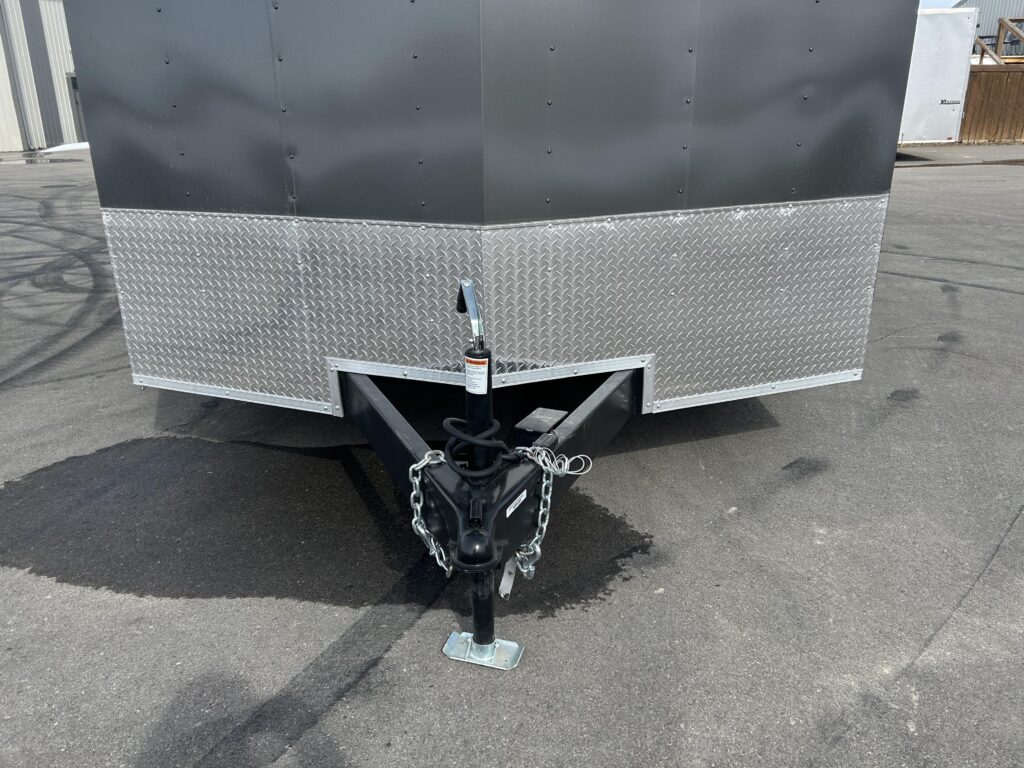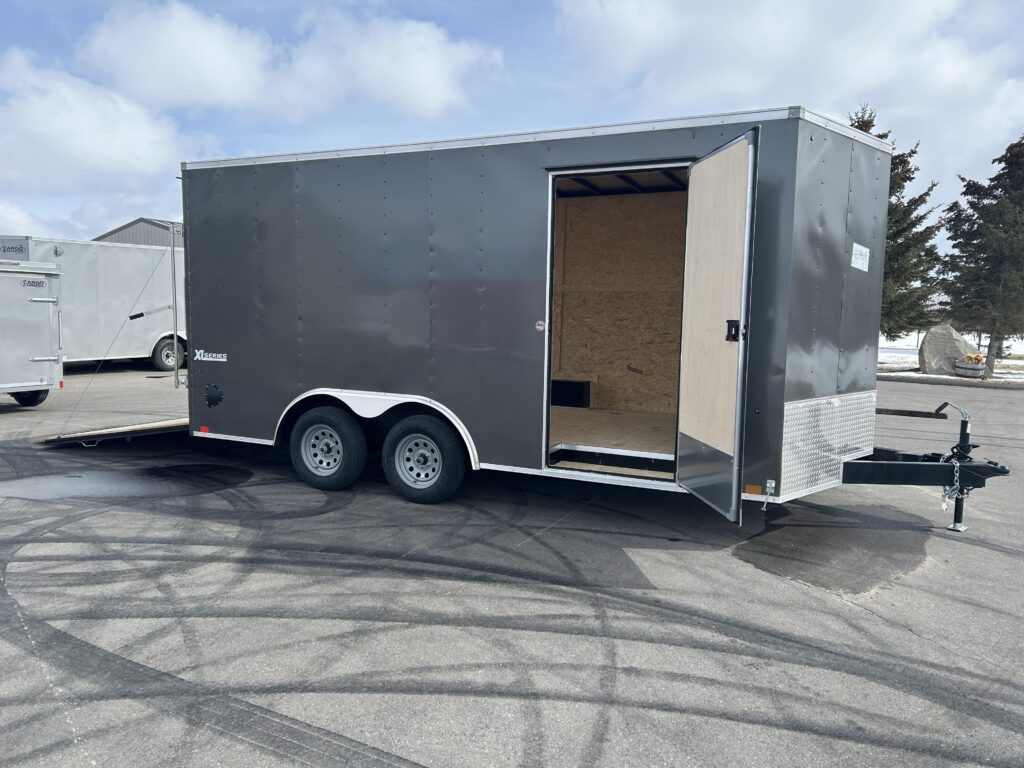 8.5×16′ enclosed cargo trailer. Beautiful charcoal exterior, 18″ v-nose