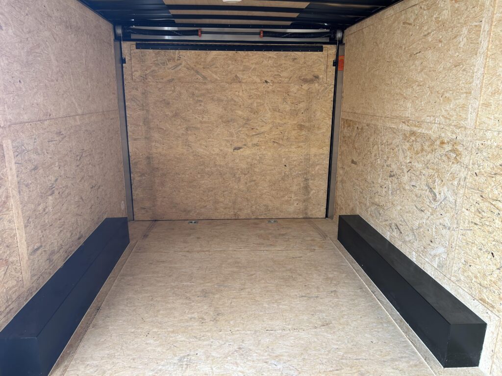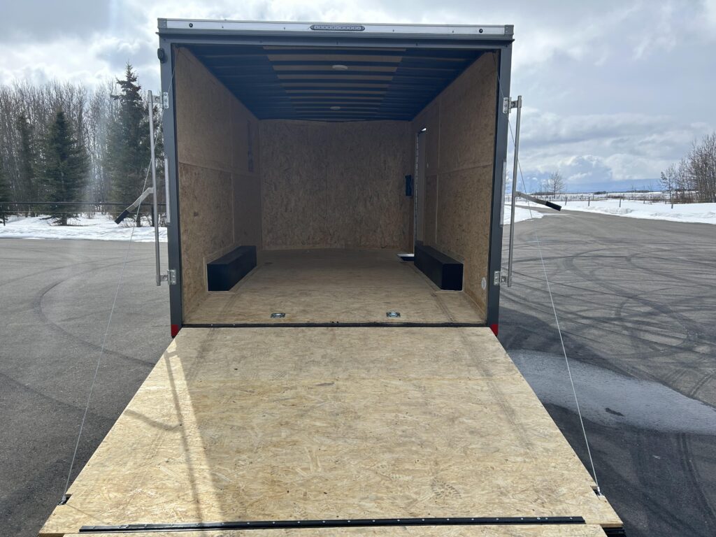 Spring assisted ramp door with 16″ ramp extension. RV man door, 2 side flow vents. 2 LED dome lights and 4-5,000lb D ring tie downs.
