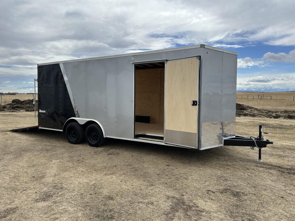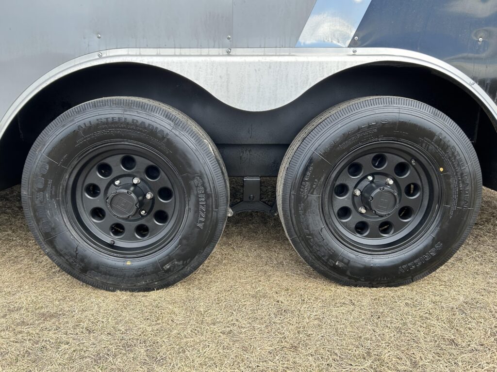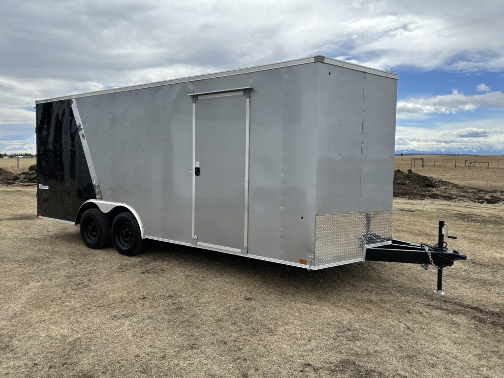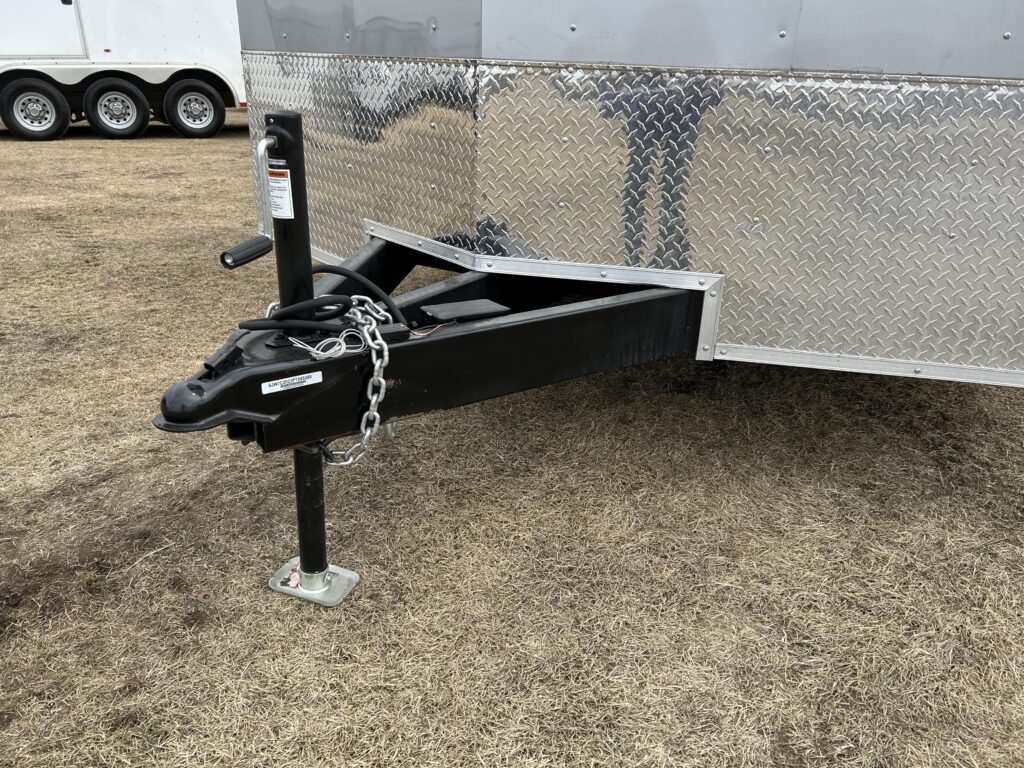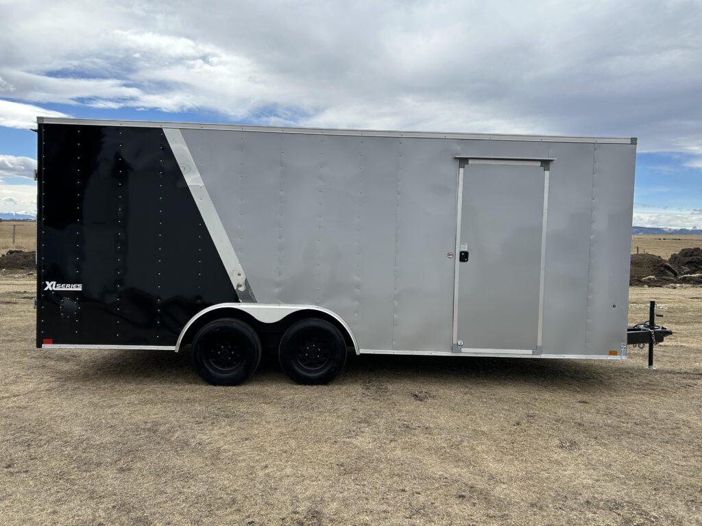 8.5×20′ black/silver enclosed trailer with an 18″ V-nose. Tandem 5,200lbs axles, spring assisted ramp door, 16″ ramp extension, RV side door. 2 dome lights and four 5,000bs tie down rings!