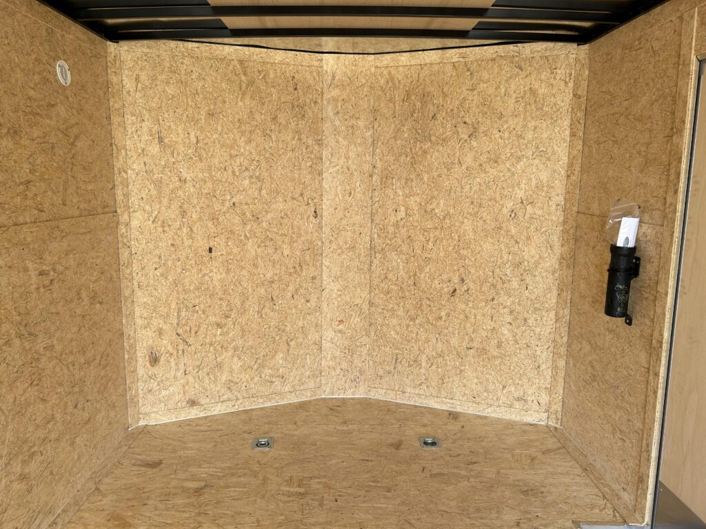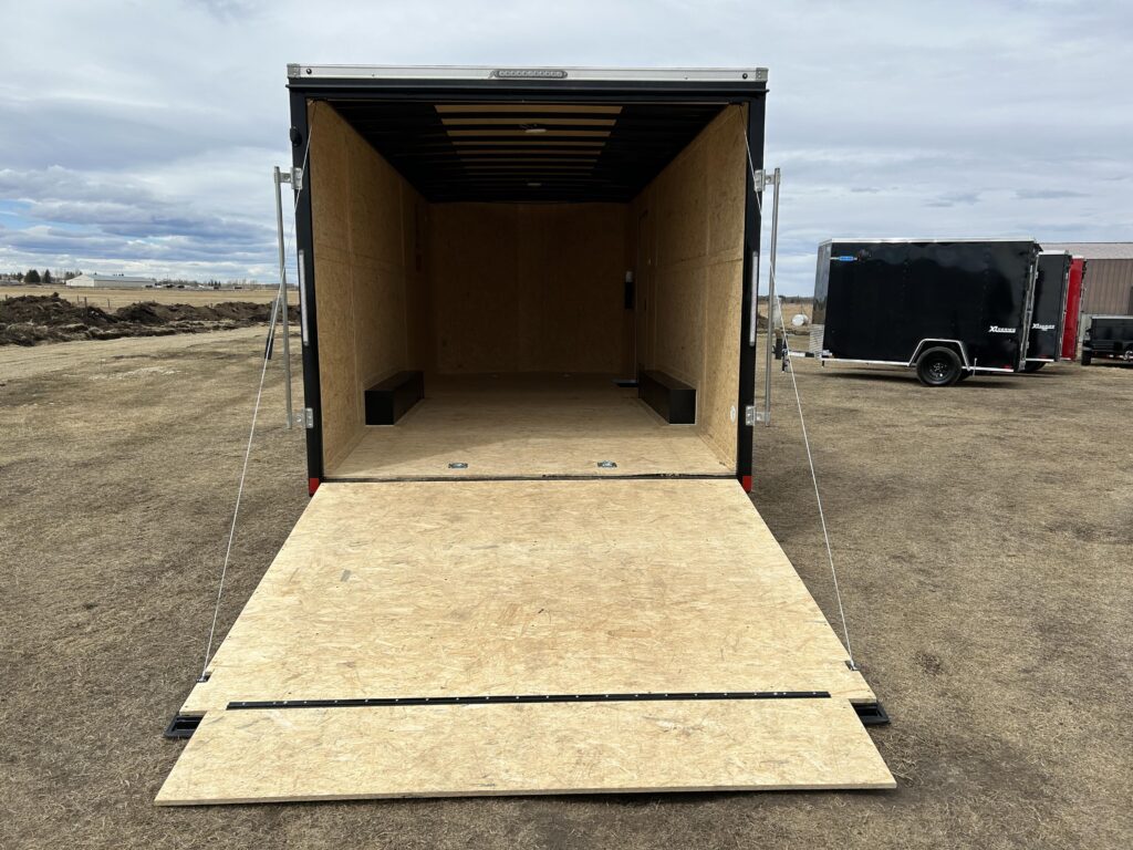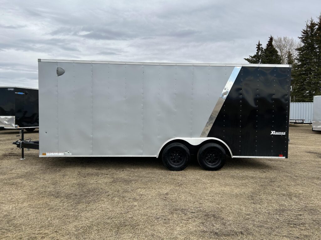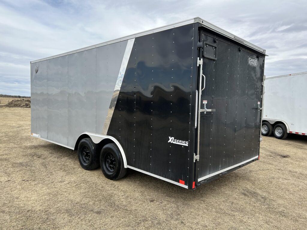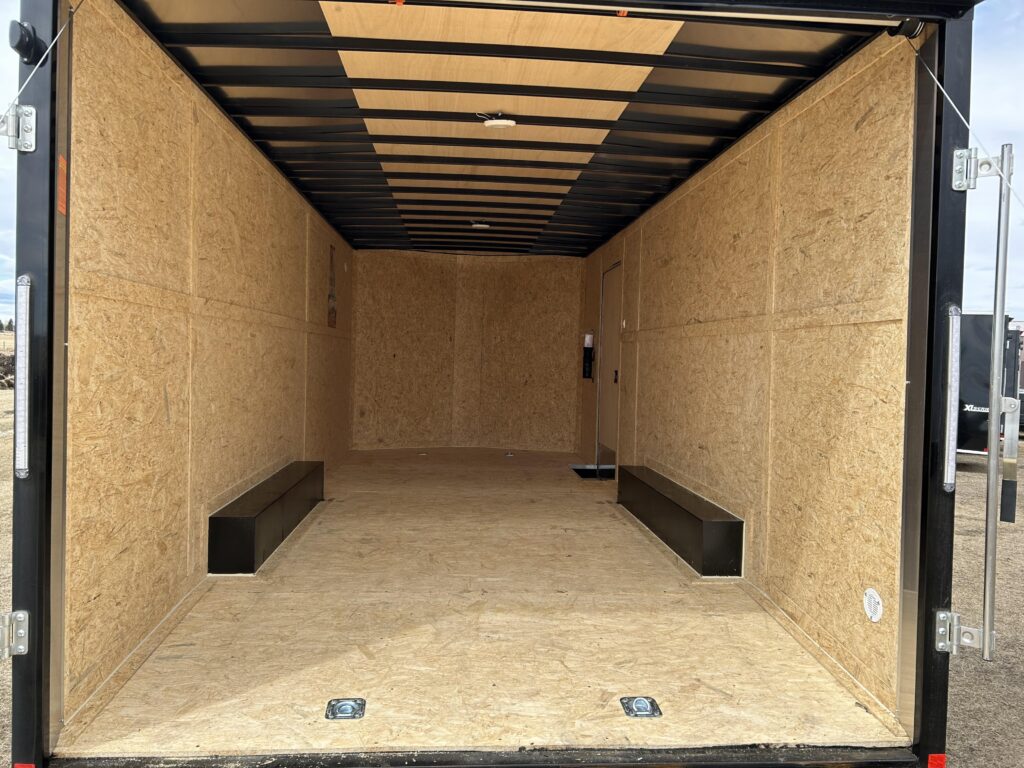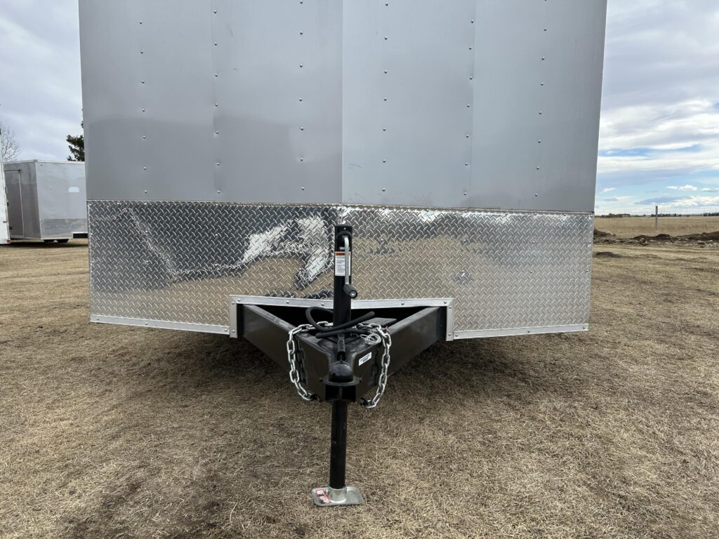 8.5×20′ black/silver enclosed trailer with an 18″ V-nose. Tandem 5,200lbs axles, spring assisted ramp door, 16″ ramp extension, RV side door. 2 dome lights and four 5,000bs tie down rings!