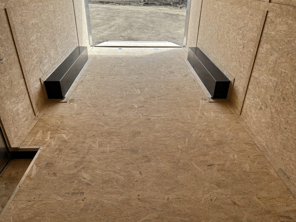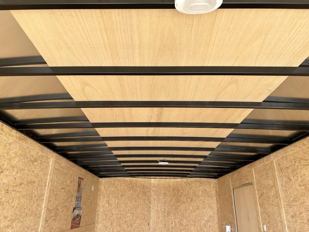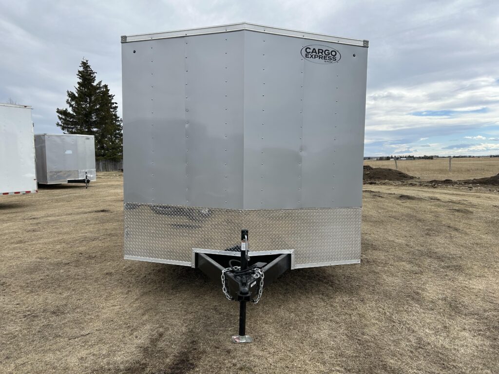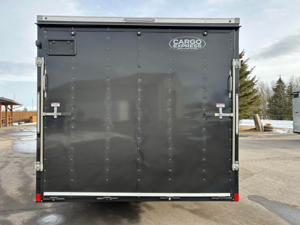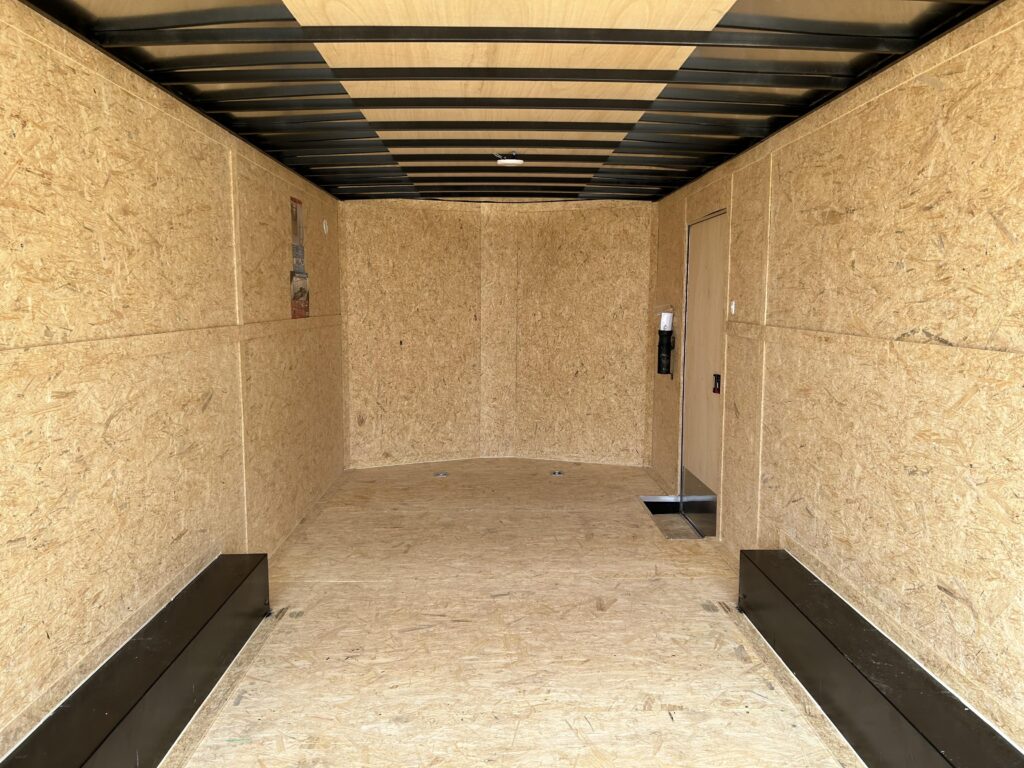 8.5×20′ black/silver enclosed trailer with an 18″ V-nose. Tandem 5,200lbs axles, spring assisted ramp door, 16″ ramp extension, RV side door. 2 dome lights and four 5,000bs tie down rings!